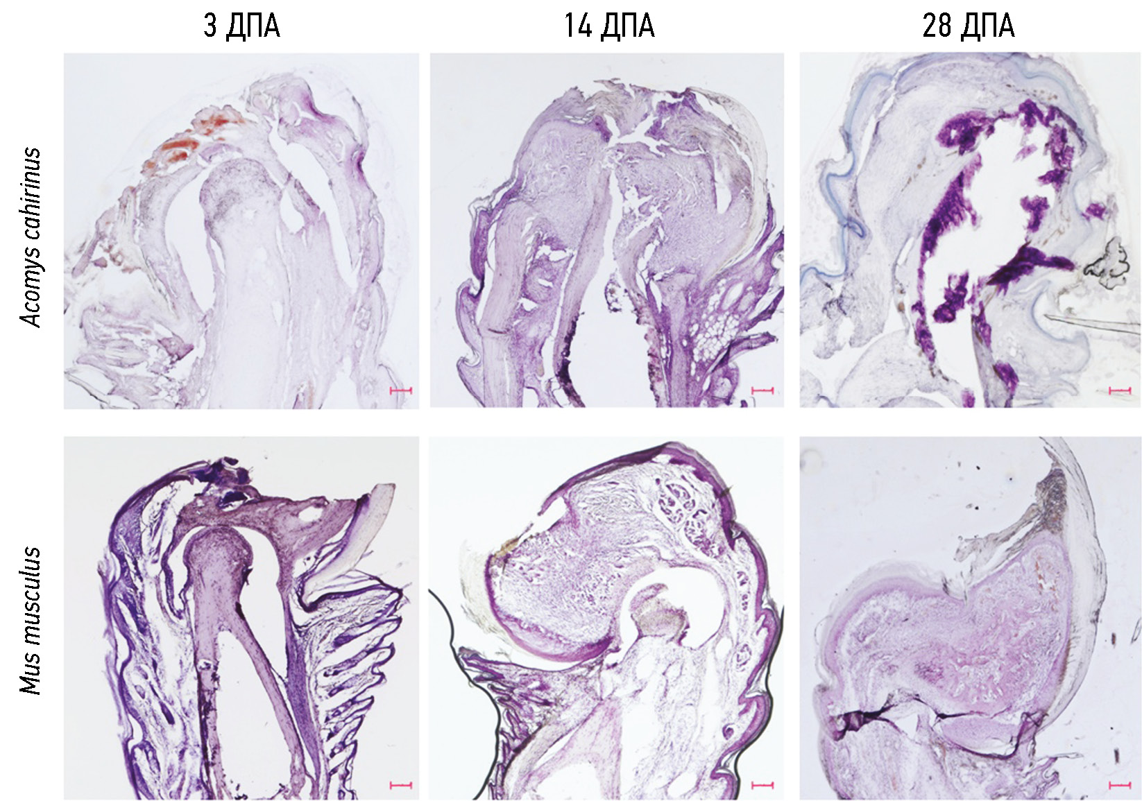 Рис. 2. Гистологический анализ сагиттальных срезов кончиков пальцев Mus musculus (нижний ряд) и Acomys сahirinus (верхний ряд) через 3, 14 и 28 дней после ампутации (ДПА): верхний ряд — на 3 день после ампутации можно видеть оставшийся после ампутации фрагмент третьей фаланги, а также эпифиз кости второй фаланги; на 14 день после ампутации визуализируется сформированная бластема с признаками начала дифференцировки; к 28 дню после ампутации обнаруживается зрелая костная ткань, растущий ноготь и восстановление других структур подушечки пальца. Нижний ряд — на 3 день после ампутации рана не полностью затянулась, при этом остаток третьей фаланги уже начинает подвергаться гистолизису, который достигает пика к 14 дню, когда третья фаланга пальца Acomys cahirinus полностью лизируется, а на её месте происходит фиброзирование, эпифиз второй фаланги также подвергается частичному гистолизису; к 28 дню после ампутации развивается гипертрофия костной ткани в области второй фаланги пальца, причём кость не подвергается декальцификации. Окрашивание гематоксилином Майера, микроскопия в проходящем свете; масштабный отрезок соответствует 100 мкм.