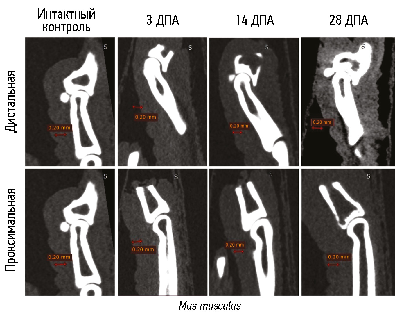 Fig. 3. Tomographic imaging of phalangeal bones in Mus musculus, intact animals and at 3, 14, and 28 days post-amputation (DPA). Upper row: amputation of the distal phalanx fragment distal to the nail bed; reduction in the stump of the damaged third phalanx is observed at 14 DPA, with restoration of its shape and structure by 28 DPA. Lower row: amputation of the distal phalanx fragment proximal to the nail bed.