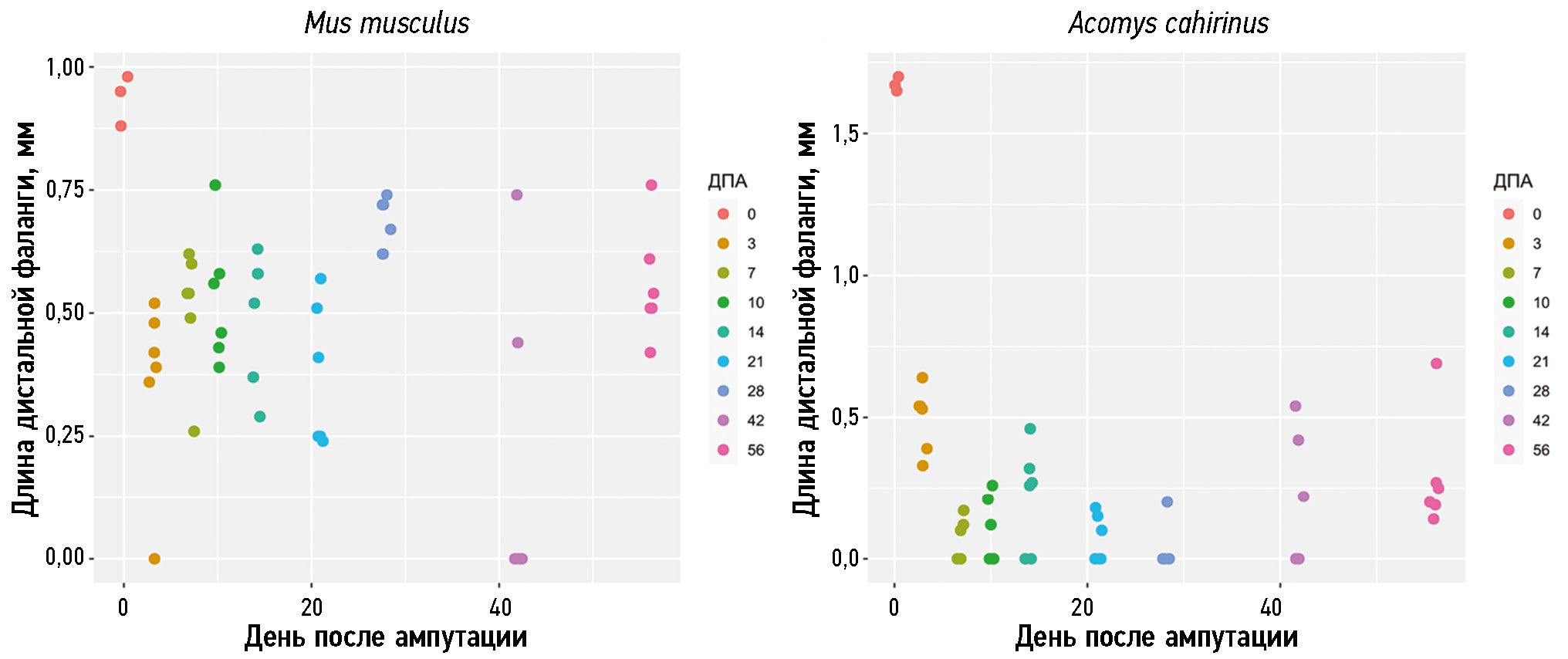 Рис. 5. Сравнительный анализ длины дистальных фаланг пальцев Mus musculus и Acomys сahirinus в различные сроки после ампутации.