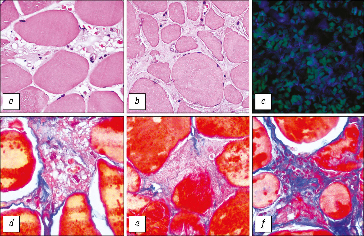 Fig. 1. Fibrin in the interstitial fluid of the endomysium: a, skeletal muscle tissue at the site of limb avulsion, 1 day after injury; b, skeletal muscle tissue at the site of limb avulsion, 4 days after injury; c, fibrinogen (blue) in the endomysium, 2 cm from the avulsion line, 1 day after injury. Fibrin in the endomysial exudate: d, e, fibrin in the endomysial exudate corresponding to an interval of up to 12 hours; f, fibrin in the endomysial exudate corresponding to 18–24 hours. Staining: a, b, hematoxylin and eosin; c, immunofluorescence with antibodies to fibrinogen (Alexa Fluor 405); d–f, Martius Scarlet Blue. Magnification: a, b, d–f, ×400; c, ×50.