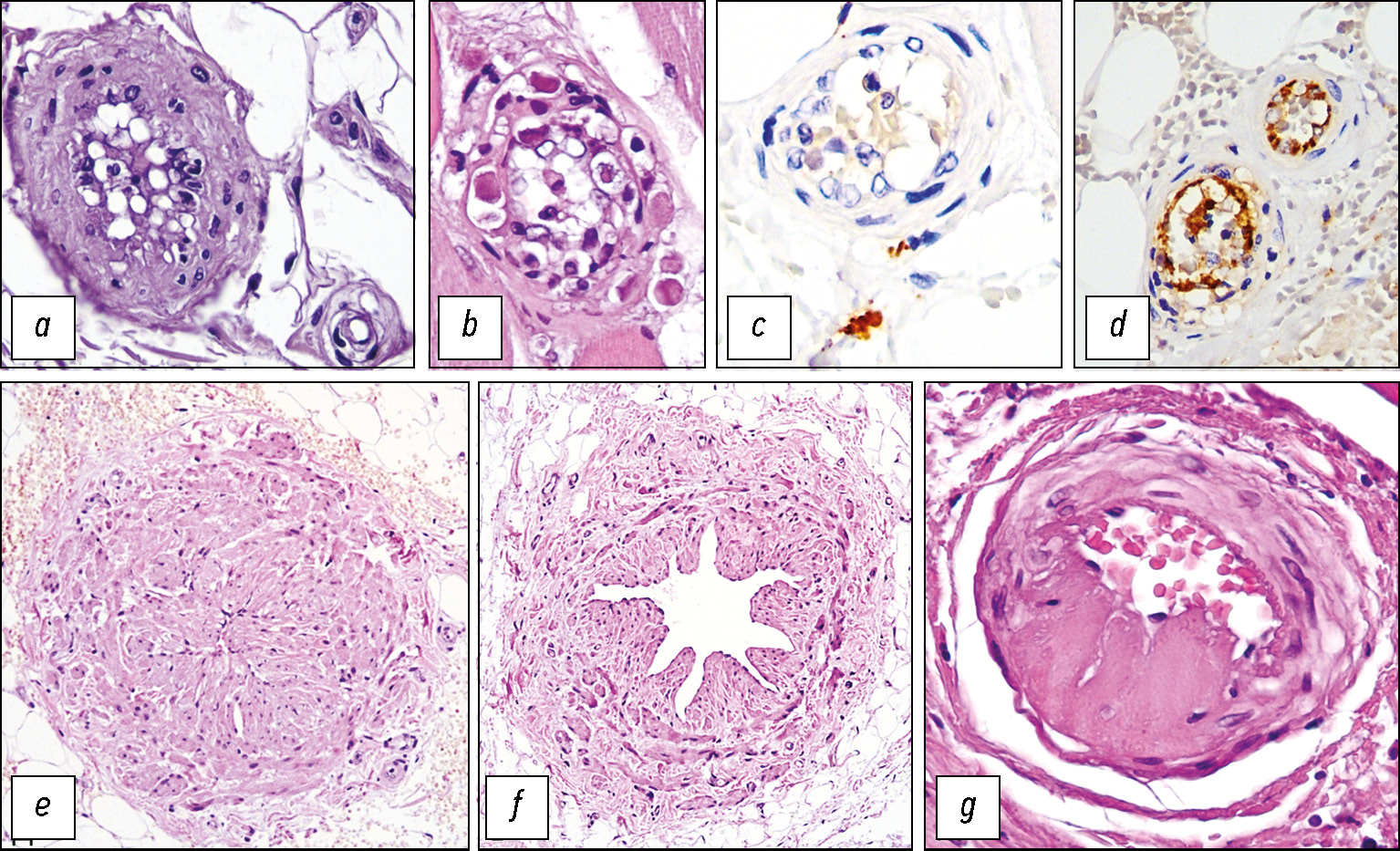 Рис. 2. Артерии эндомизия и перимизия, спустя 1 сутки после травмы, на расстоянии 2–4 см от линии отрыва: a — воздушная и (или) жировая эмболия, десквамация эндотелиоцитов; b — отёк сосудистой стенки и её клеток, десквамация эндотелиоцитов; c, d — частичная обтурация просвета десквамированными эндотелиоцитами; e, f — артерии в состоянии спазма; g — частичный (полуциркулярный) некроз и отёк сосудистой стенки, расслоение tunic adventitia. Окраска: a, b, e–g — гематоксилином и эозином; c — результат иммуногистохимической реакции с антителами к CD68; d — результат иммуногистохимической реакции с антителами к CD31. Увеличение: a–d, g ×400; e, f ×100.