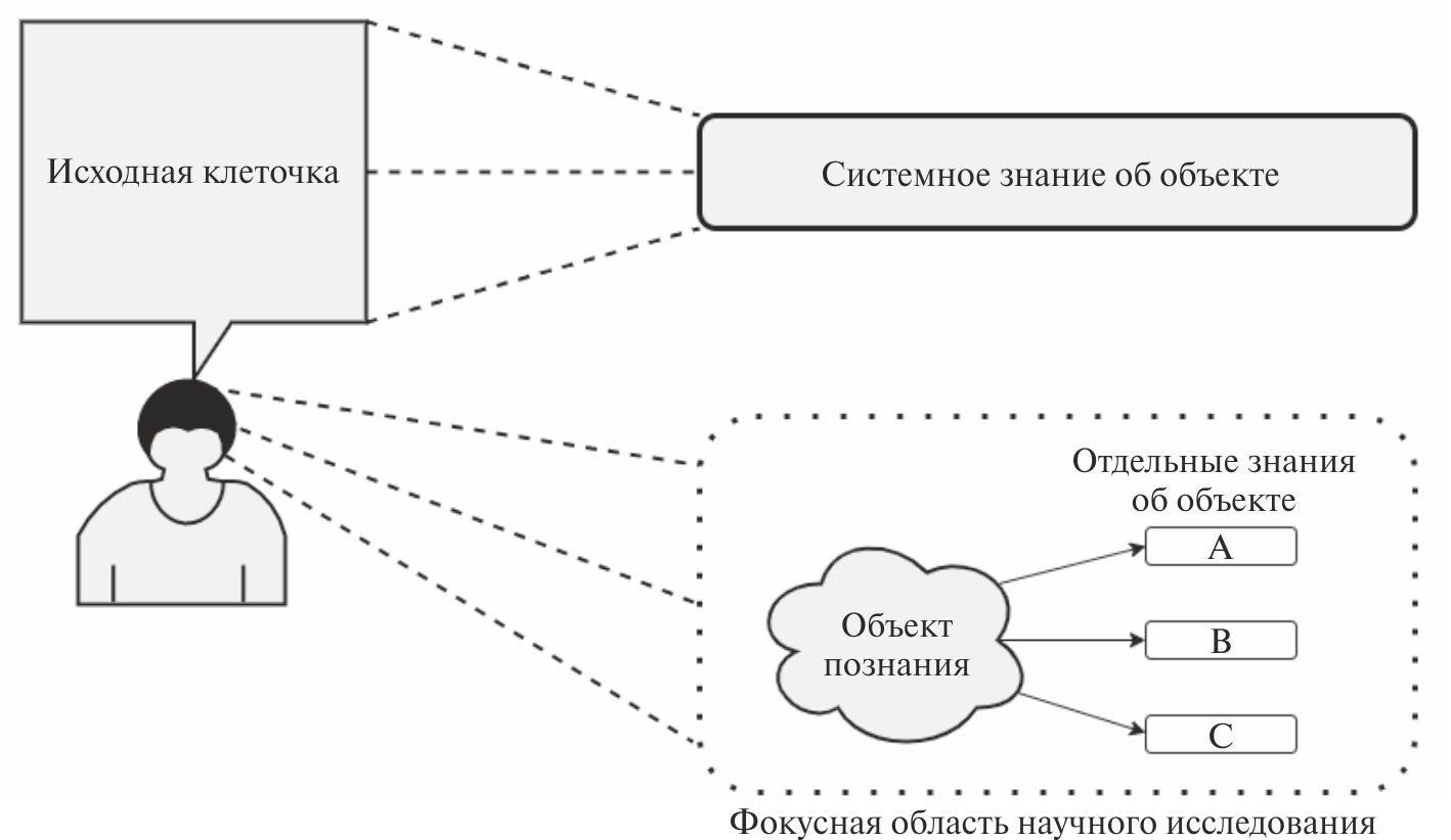 В процессе восхождения от абстрактного к конкретному выделенная фокусная область подлежит рассмотрению под углом зрения исходной клеточки как своеобразной линзы научного восприятия. В результате такого переосмысления накопленных знаний как раз и происходит их системная интеграция, что наглядно можно представить с помощью условной схемы (рис. 2).