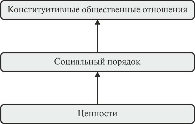 Предпринятый методологический поворот состоит в радикальной смене понимания предмета конституционного права. Исходный и главный его элемент отныне – не общественные отношения сами по себе, а лежащий в их основе социальный порядок как всеобщая форма общественного бытия, сформированный на сложившихся в обществе ценностях, поддержание которых осуществляется государством, а его деятельность, в свою очередь, программируется конституционным правом. Отсюда следует основополагающий вывод о многослойном характере предмета конституционного права, в составе которого – при нашем понимании данного подхода – можно выделить три основные составляющие: во-первых, сложившиеся в российском обществе ценности, выработанные российским народом в процессе исторического развития нашей страны; во-вторых, исходящий из этих ценностей и легитимированный волей российского народа социальный порядок; в-третьих, складывающиеся на этой основе конститутивные по своей природе, действительно основополагающие общественные отношения.