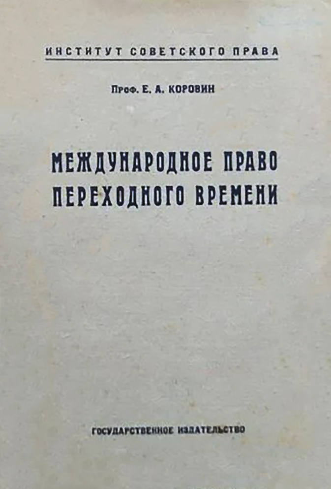 Первая монография Е. А. Коровина «Международное право переходного периода» 2, вышедшая в 1923 г., стала основополагающей для всех его последующих работ. На фоне нехватки квалифицированных кадров юристов она была так популярна, что уже в следующем году в свет вышло второе издание под названием «Международное право переходного времени» 3. Этими книгами фактически начинается советская наука международного права.