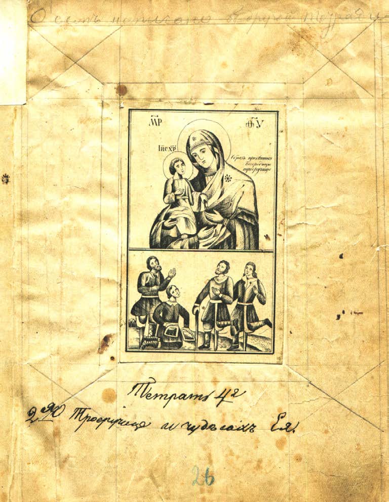 Fig. 1. The title page of the notebook containing a description of the miracles f the Beloberezhskaya icon “Troeruchitsa” (Department of Manuscripts of the Russian National Library. Collection of P. N. Tikhanov. No. 214. Sheet 26)