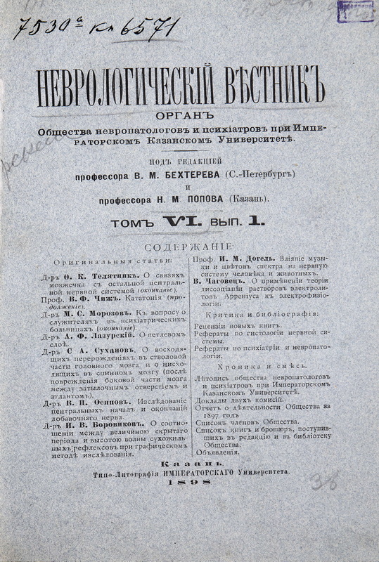 By this year, the Society begins the seventh year of its activity, which in the past year was expressed in the following. In 1897, the Society had 8 meetings; including 1 year, 1 emergency and 6 regular. In the next scientific posts, 14 messages were sent on the following subjects: 1) V.P. Kovalevskiy. The volume of changes in the nerve cells of the intervertebral nodes during irritation of the peripheral nerves. 2) M.M. Maevskiy. A case of epidemic insanity on religious grounds. 3) K. A. Arnstein. Remembrance of the volume by I. Kh. Akerblom. 4) V.I. Zhestkov. A case of hysterical aphasia. 5) N.E. Grinstein. To the innervations of the bladder. 6) N.N. Poroshin. The volume of changes in the automatic nerve nodes of the heart under the influence of chloroform. 7) N.M. Popov. A case of erythrophobia. 8) E.A. Genika. Folie à deux case. 9) H. M. Popov. To casuistic traumatic neuroses. 10) P.A.Mislavskiy. About bilateral conduction in nerves. 11) K.A. Arnstein. Experience in the taxonomy of nerve endings. 12) D.V. Polumordvinov. Method of coloring Nissl'evskih tel. 13) I.M.Dogel. About the influence of music on the nervous system of man and animals. 14) M. M. Maevskiy. Demonstration of the epileptic brain. In addition, in the last year of D.V. Polumordvinov uttered a rch under the title: "Our information about the processes that lie in the basis of the active state of the nerves".