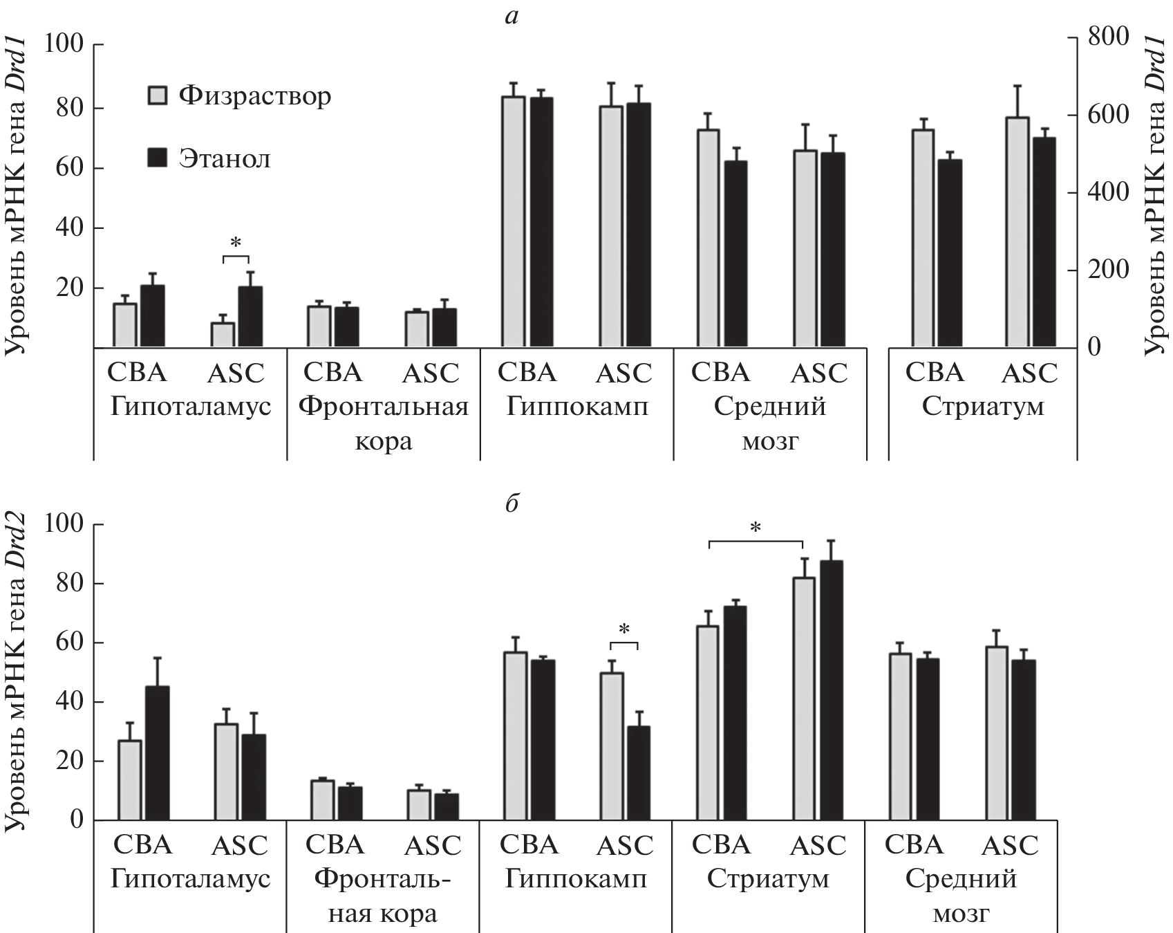 Depressive disorders and alcohol dependence are among the most common psychopathologies. It is known that disorders in the serotonergic and dopaminergic brain systems functioning lie in the pathogenesis of alcoholism and affective disorders. In this work, we studied the effects of prolonged administration of ethanol (1.5 g/kg, 20%, 10 days, i.p.) on behavior, functional activity of 5-HT1A and 5-HT2A receptors and expression of genes encoding serotonin (Htr1a, Htr2a) and dopamine (Drd1, Drd2) receptors in brain structures in mice of ASC strain (with the genetic predisposition to depressive-like behavior) and mice of the parental (“non-depressive”) CBA strain. It has been shown that alcoholization leads to an increase in motor activity in animals of both lines and an increase in the level of exploratory behavior in ASC mice. No significant effect of ethanol on social and depression-like behavior was found. The functional activities of 5-HT1A and 5-HT2A receptors (determined by the response to the administration of corresponding receptor agonists) were reduced by ethanol only in ASC animals. A decrease in 5-HT2A receptor gene expression was found in the frontal cortex of CBA mice treated with alcohol. At the same time, ethanol led to an increase in the mRNA levels of the 5-HT1A receptor gene in the striatum and the DRD1 receptor gene in the hypothalamus, as well as a decrease in the expression of the DRD2 receptor gene in the hippocampus of ASC mice. Thus, changes in the serotonergic and dopaminergic brain systems induced by chronic ethanol were more significant in ASC mice with a genetic predisposition to depression-like behavior.