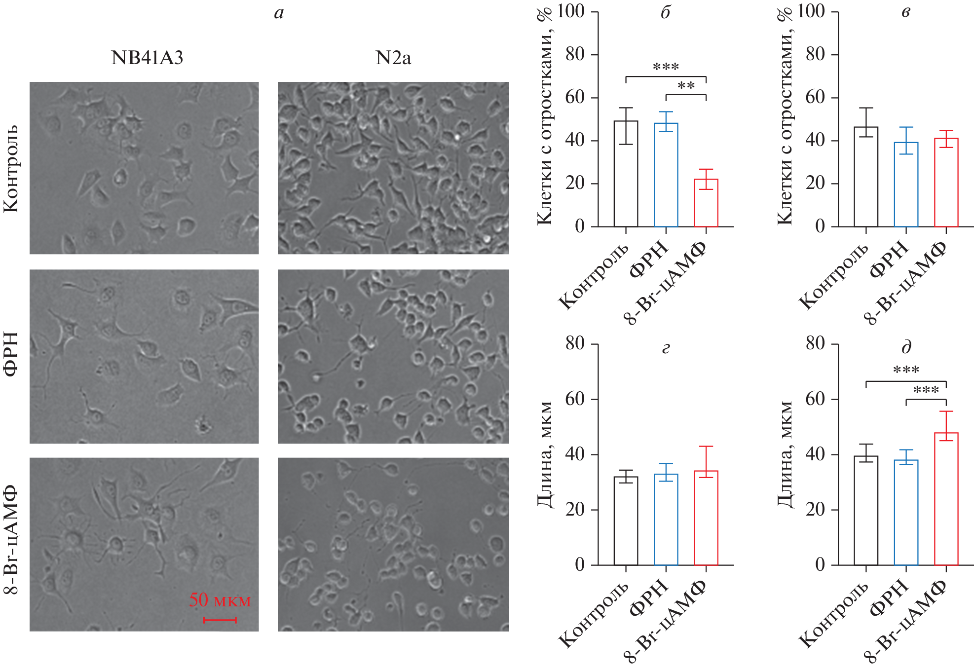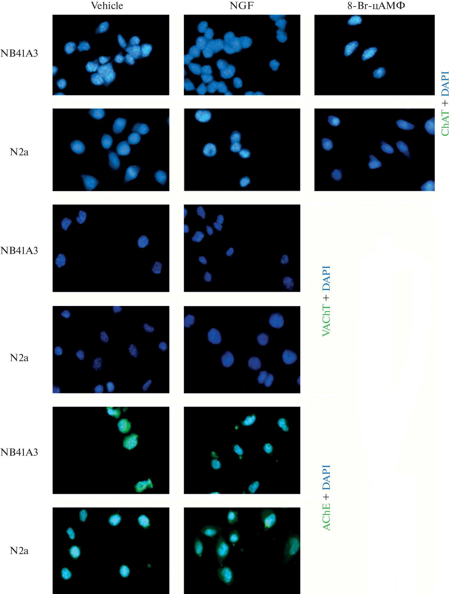 Фактор роста нервов (ФРН) является фактором, определяющим дифференцировку нейронов. ФРН играет важную роль в росте и дифференцировке сенсорных и симпатических нейронов в периферической нервной системе. В зрелом мозге ФРН участвует в поддержании холинергического фенотипа нервных клеток. В работе была исследована возможность индукции холинергического фенотипа в клетках нейробластомы мыши, которые часто используются для моделирования разных физиологических и патологических процессов, протекающих в нервной системе. Клетки нейробластомы линий NB41A3 и Neuro2a чаще всего используются, когда необходимо исследовать свойства холинергических нейронов. В клетках этих линий была обнаружена экспрессия рецепторов TrkA и p75NGFR, которая характерна для холинергических нейронов базальных ядер переднего мозга. Дифференцировку клеток вызывали аппликацией ФРН или 8-Br-цАМФ. ФРН не вызывал выраженной дифференцировки клеток по нейрональному фенотипу. Кроме того, не было обнаружено изменений содержания мРНК и белка холинацетилтрансферазы и везикулярного транспортера ацетилхолина, которые использовали в качестве маркеров холинергического фенотипа. Таким образом, клетки линий NB41A3 и Neuro2a не могут быть рекомендованы для использования в качестве модели холинергических нейронов in vitro, поскольку они не дифференцируются и/или не демонстрируют признаков холинергического фенотипа в ответ на стимуляцию ФРН.
