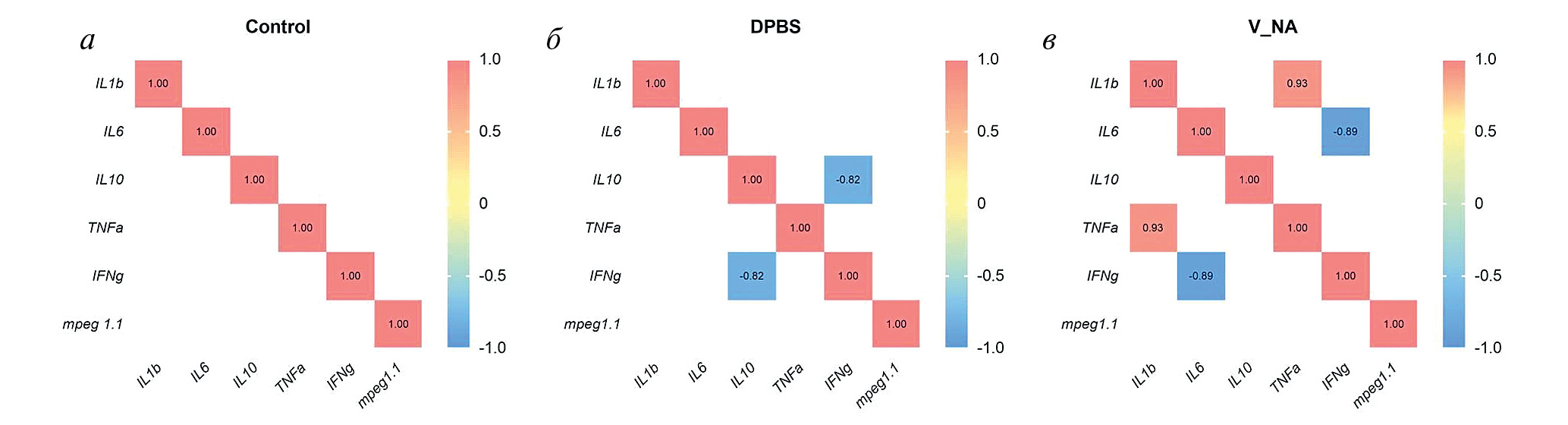 Корреляционный анализ выявил положительные связи между уровнями экспрессии генов в группе контроля (рис. 6, a); в группе V_NA (рис. 6, в); в группах V_PMA1 (рис. 6, г), V_TNF1 (рис. 6, д) и V_TNF2 (рис. 6, е). Отрицательная корреляция наблюдалась только в группе V_PMA1 между уровнями экспрессии генов il-1β и mpeg1.2.
