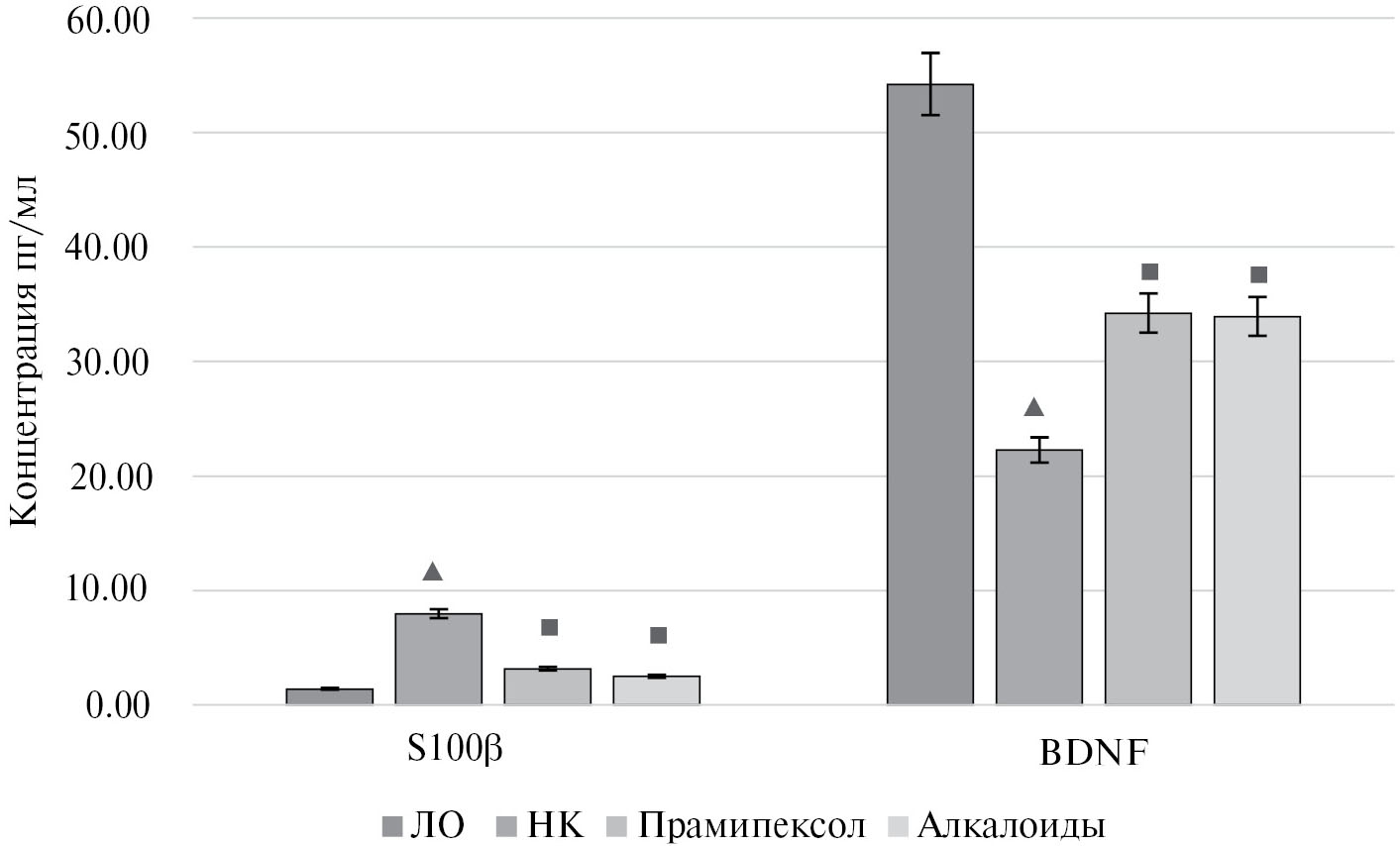 Рис. 2. Влияние прамипексола и смеси соланина и чаконина на изменение концентрации белка S100β и субстанции BDNF в тканях головного мозга у крыс с болезнью Паркинсона. ▲ — достоверно относительно ЛО; ■ — достоверно относительно НК.