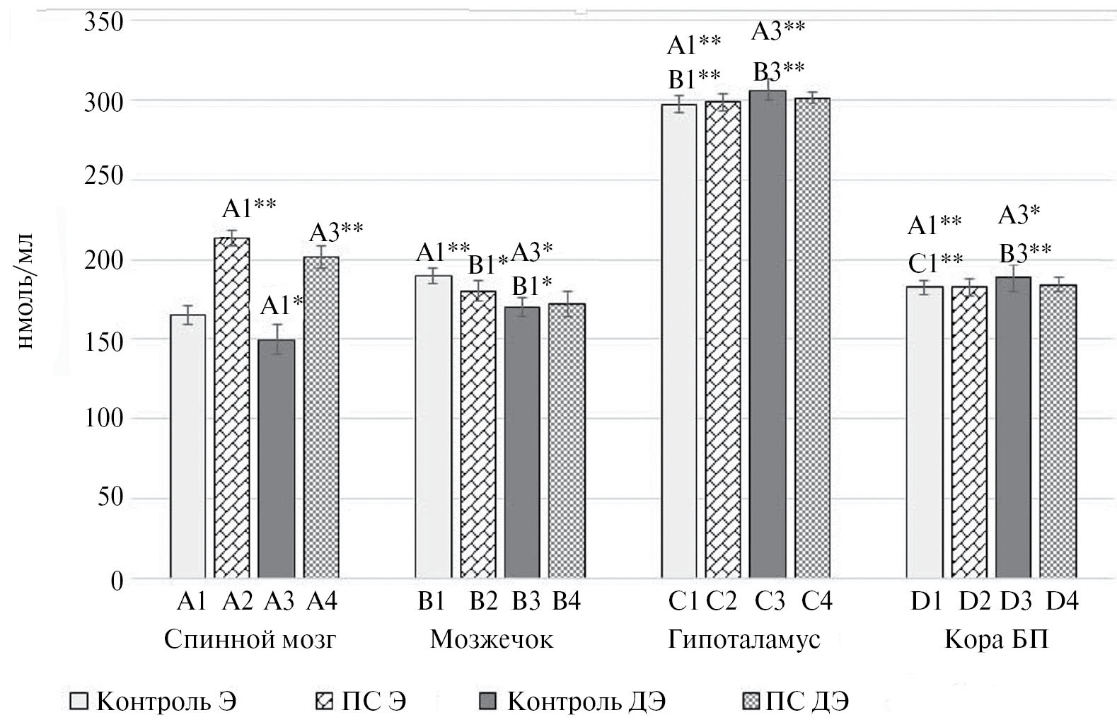 Рис. 2. Уровень NO-метаболитов в отделах мозга пренатально стрессированных самок крыс, нмоль/мл. Примечание: статистически значимые различия между сравниваемыми группами р < 0.05 – *, р < 0.01 – **, U-критерий Манна – Уитни; ПС – пренатальный стресс; Э – эструс; ДЭ – диэструс.