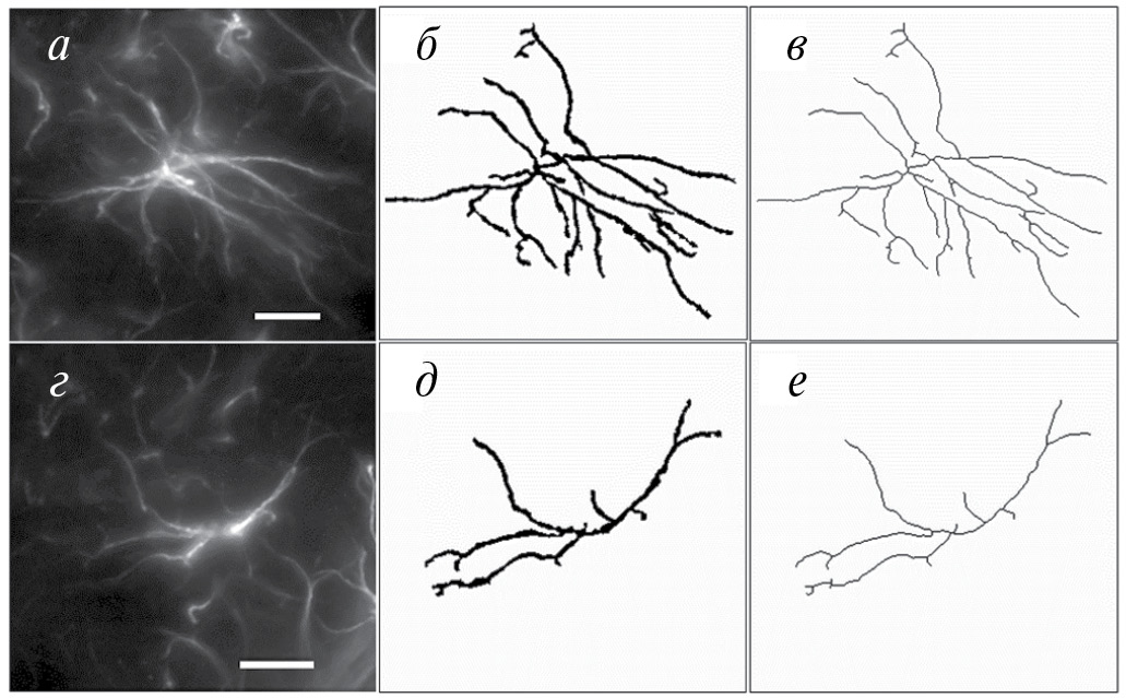 Рис. 1. Этапы обработки изображения астроцита от микрофотографии до графа-скелетона на примере более (а–в) и менее (г–е) разветвленных клеток. а, г – микрофотография астроцита, б, д – бинаризованное изображение, в, е – скелетонизированное изображение. Шкала – 10 мкм.