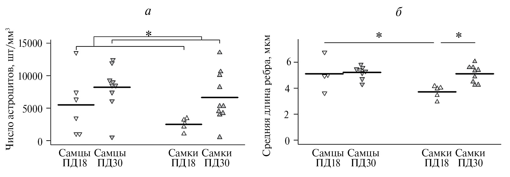 Рис. 2. Результаты статистической обработки полученных морфологических характеристик. а – увеличение плотности популяции астроцитов в базолатеральном ядре миндалины с возрастом: F(1, 26) = 5.46, p = 0.027, нет эффекта пола. б – увеличение средней длины ребра графа-скелетона обнаружено у самок, но не у самцов: “пол”*“возраст” – (F(1, 22) =4 .52, p = 0.045), самцы ПД18 vs самки ПД18 – p = 0.040, самки ПД18 vs самки ПД30 ‒ (p = 0.011) (Тьюки post hoc). Среднее значение по группе отмечено горизонтальной полосой.