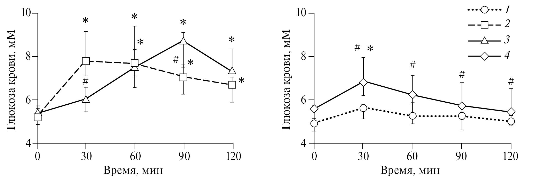 Р – рандомизация на группы (3, 4 или 6 групп по 10 животных в каждой), О – отдых, М 2 и М 4 – сбор мочи 2 и 4 часа, Г 30 и Г дин – определение глюкозы капиллярной крови из кончика хвоста на 30 мин или в динамике на 0, 30, 60, 90 и 120 мин эксперимента. Э 0.05, Э 0.15, Э 0.5, Э 1.5 и Э 5 – эксенатид в дозах 0.05, 0.15, 0.5, 1.5 и 5 нмоль/кг, ГПП-1 – глюкагоноподобный пептид-1 (1.5 нмоль/кг), В – вилдаглиптин (1 мг/кг), П – пентамин (30 мг/кг), α – фентоламин (1 мг/кг), α1 – доксазозин (1 мг/кг), α2 – раувольсцин (1 мг/кг), β – пропранолол (5 мг/кг), β1 – атенолол (2 мг/кг), β2 – ICI-118551 (1 мг/кг), β3 – L-748337 (1 мг/кг), К – контроль ($ – 0.9% раствор NaCl внутримышечно 1 мл/кг, # – 5% ДМСО внутрибрюшинно 1 мл/кг + 0.9% раствор NaCl внутримышечно 1 мл/кг, & – 0.9% NaCl внутрибрюшинно 1 мл/кг, § – вода для инъекций внутрибрюшинно 1 мл/кг + 0.9% раствор NaCl внутримышечно 1 мл/кг). В некоторых сериях дополнительно к эксенатиду в качестве контроля к антагонистам адренорецепторов вводили: @ – вода для инъекций внутрибрюшинно 1 мл/кг, * – 5% водный раствор ДМСО внутрибрюшинно 1 мл/кг