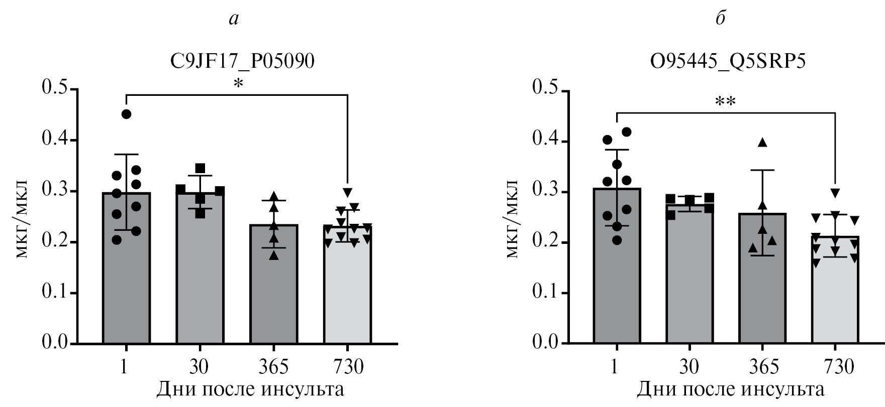 Рис. 3. Уровень аполипопротеинов: Апо-D(а), Апо-М(б), в экзосомах сыворотки крови пациентов на разных сроках после ИИ. Статистические различия между временными точками оценивались при помощи one-way ANOVA теста с post-hoc анализом при помощи теста Тьюки. *p < 0.05, **p < 0.01