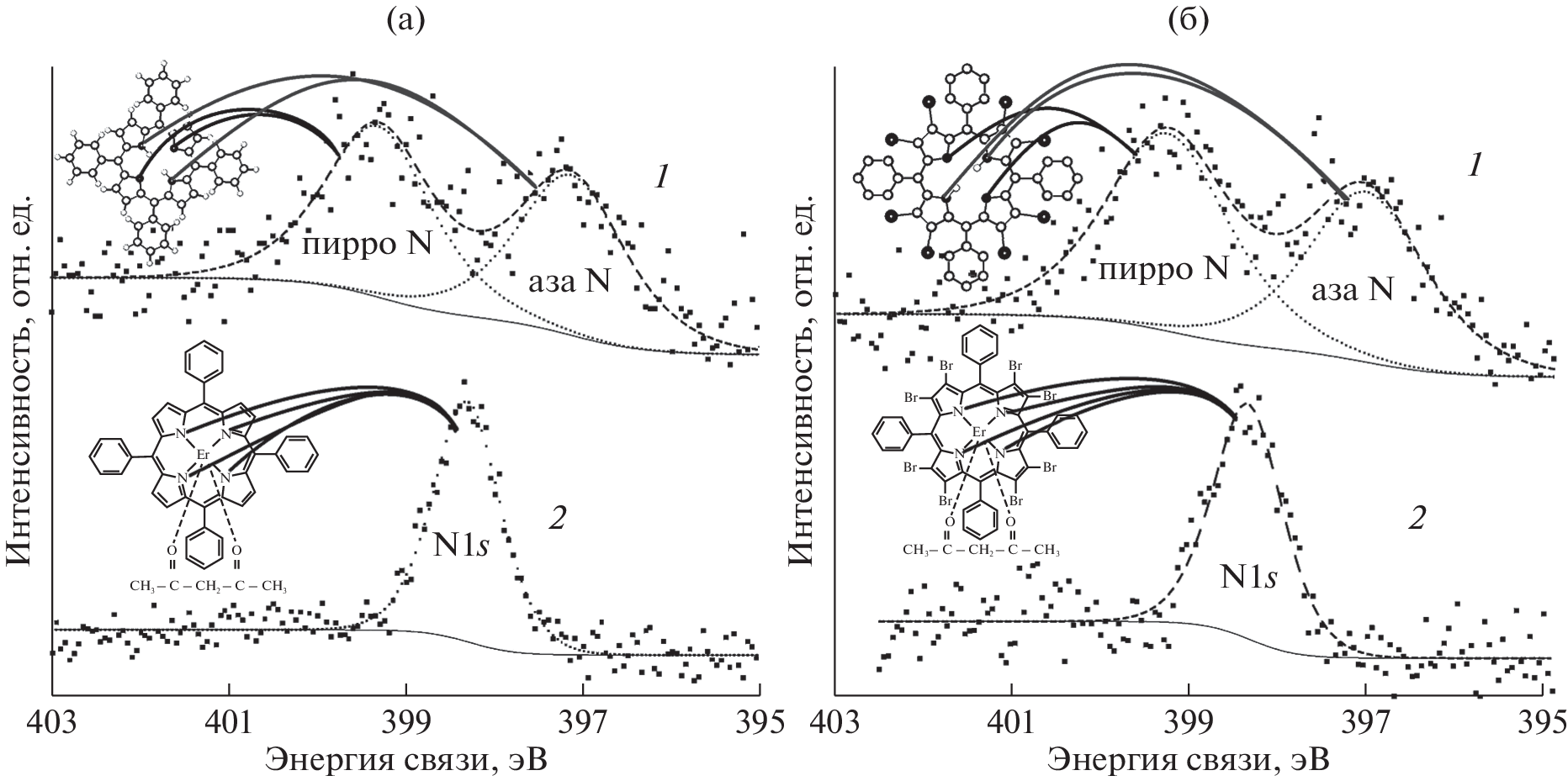 The features of the electronic and local atomic structure of erbium metalloporphyrins Er(acac)TPPBr8, Er(acac)TPP and precursor tetraphenylporphyrins (TPP and TPPBr8) have been studied by X-ray photoelectron spectroscopy and X-ray absorption spectroscopy. Using photoelectron spectroscopy, the structure parameters of the Er4d, N1s, C1s, O1s, Br3d core levels and the valence band have been determined. The nature of the change in the electronic structure of tetraphenylporphyrins upon the introduction of the central erbium atom has been established – a uniform redistribution of the electron density between the nitrogen atoms of the pyrrole and aza groups. From the analysis of the X-ray absorption spectra, the effect of bromine addition in the meso-position of the macrocycle on the parameters of the local atomic structure of the erbium porphyrin complex has been established, and the integer trivalent state of the metal (Er3+) in rare-earth metalloporphyrins has been confirmed.