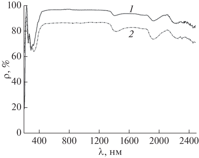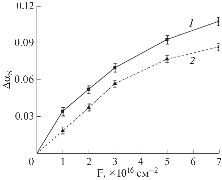 The effect of fluence (1–7) × 1016 cm–2 electrons with an energy of 30 keV on the concentration of color centers in aluminum oxide hollow particles micron-sized in comparison with bulk Al2O3 microparticles was studied. The analysis was carried out using diffuse reflectance spectra in the range from 250 to 2500 nm in situ. The radiation resistance of the microspheres under study was evaluated relative to micropowders from the difference diffuse reflectance spectra obtained by subtracting the spectra after irradiation from the spectra of non-irradiated samples. Changes in the difference diffuse reflection spectra of aluminum oxide microparticles and microspheres obtained with different electron fluences showed that with an increase in the induced electron fluence, absorption increases throughout the spectrum. It was found that the radiation resistance of aluminum oxide microspheres to the effects of electrons with an energy of 30 keV a fluence (1–7) × 1016 cm–2 greater than the radiation resistance of Al2O3 microparticles. The increase in the radiation resistance of aluminum oxide hollow microparticles compared to the radiation resistance of aluminum oxide bulk microparticles is due to the low concentration of induced defects of the anionic sublattice.