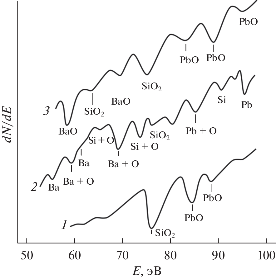 In this work, using the methods of Auger electron spectroscopy, ultraviolet photoelectron spectroscopy and light absorption spectroscopy, the influence of the implantation of Ba+ ions into silicate glass and subsequent annealing on the composition, density of electronic states and parameters of energy bands was investigated. It has been shown that nonstoichiometric oxides Si, Pb, and Ba, as well as unbound atoms of the same elements, are formed in the ion-implanted layer after ion implantation. As a result, there is a significant change in the electronic structure of silicate glass, in particular, the band gap decreases by ∼2 eV. After annealing at T = 1000 K, unbound Si, Pb, and Ba atoms disappear in the ion-implanted layer (within the sensitivity of the Auger electron spectrometer) and stoichiometric oxides such as SiO2, PbO, and BaO are formed.