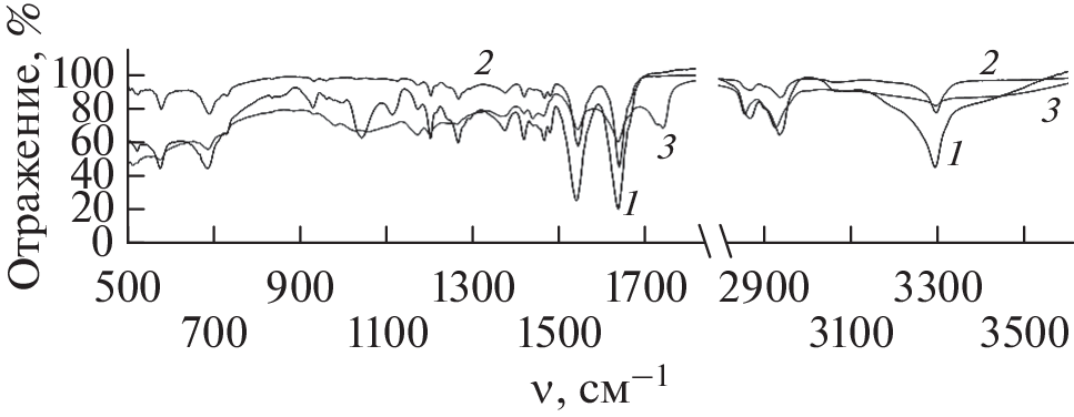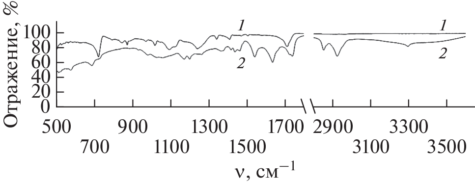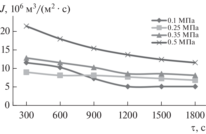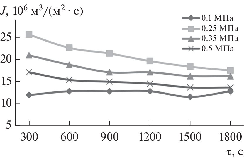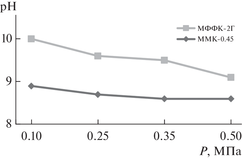 IR spectroscopy was used to study the structure of the surface layer of air-dry, water-saturated and working samples of microfiltration composite membranes MMK-0.45 and MFFC-2G based on polyamide and fluoroplast, respectively. IR spectra were analyzed in the frequency ranges 500–1700 and 2800–3400 cm–1. In the case of the polyamide membrane, the main peaks of the functional groups of polymers in the IR spectra of dry, water-saturated, and working samples coincide. The absorption bands of polyamides range from 650 to 5000 cm–1, corresponding to the peptide bond. In the absorption band of 1650 cm–1, bending vibrations of the carbonyl group occur, and in the band of 1550 cm–1, bending vibrations of the N–H bond are observed. The 3500–3000 cm–1 region is the stretching vibrations of the NH, OH and water groups. In the case of the working sample of the MFFC-2G fluoroplastic membrane, the stretching vibrations of the fluorine-substituted groups lie in the range 1100–1400 cm–1; they correspond to the C–F stretching vibrations (1198 and 1171 cm–1). The IR spectrum also shows two peaks in the region 2800–3000 cm–1; they are characteristic of biodiesels from vegetable oils. Studies of the specific output flow and the change in the pH of the permeate depending on time and transmembrane pressure were carried out. There are several periods of a decrease in the specific output flux depending on time, which is most likely due to the unblocking of the membrane pores by organic compounds in the solution being separated, and the possible formation of a boundary gel layer. The decrease in the pH of the permeate with an increase in the transmembrane pressure on the MMK-0.45 and MFFC-2G microfiltration membranes is probably due to an increase in the rate of migration of organic acids through the helium layer and the working layer of the membrane.