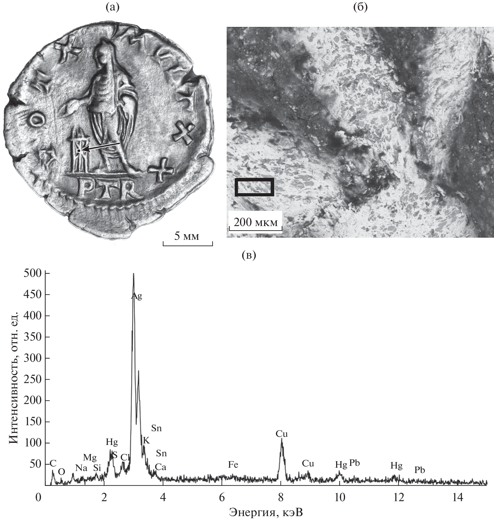 Two ancient Roman silver coins dating back to the 3rd–4th century AD were studied. A set of modern micro- and non-invasive analytical techniques was used: a focused ion beam, scanning electron microscopy, energy dispersive X-ray microanalysis, micro-X-ray fluorescence analysis, neutron radiation analysis, and other methods. The research showed that Ag–Cu and Ag–Cu–Pb–Sn alloys were used, common in the prosperous years of the Roman Empire, when the Romans produced alloys with a relatively high silver content for both outer layers and the inner core of the coins. Surface silvering processes were used during different periods of crisis under the reign of Antoninii. It was established that even during the crisis, the Romans produced high quality “Antoninianus”, attempting to improve the silvering procedure using silver amalgam (Hg–Ag) – mercury was detected in the near-surface silver layer of the coins. A porous morphology of the coin surface was also revealed, which might be the result of an uncontrolled heating process and the removal of mercury through boiling.