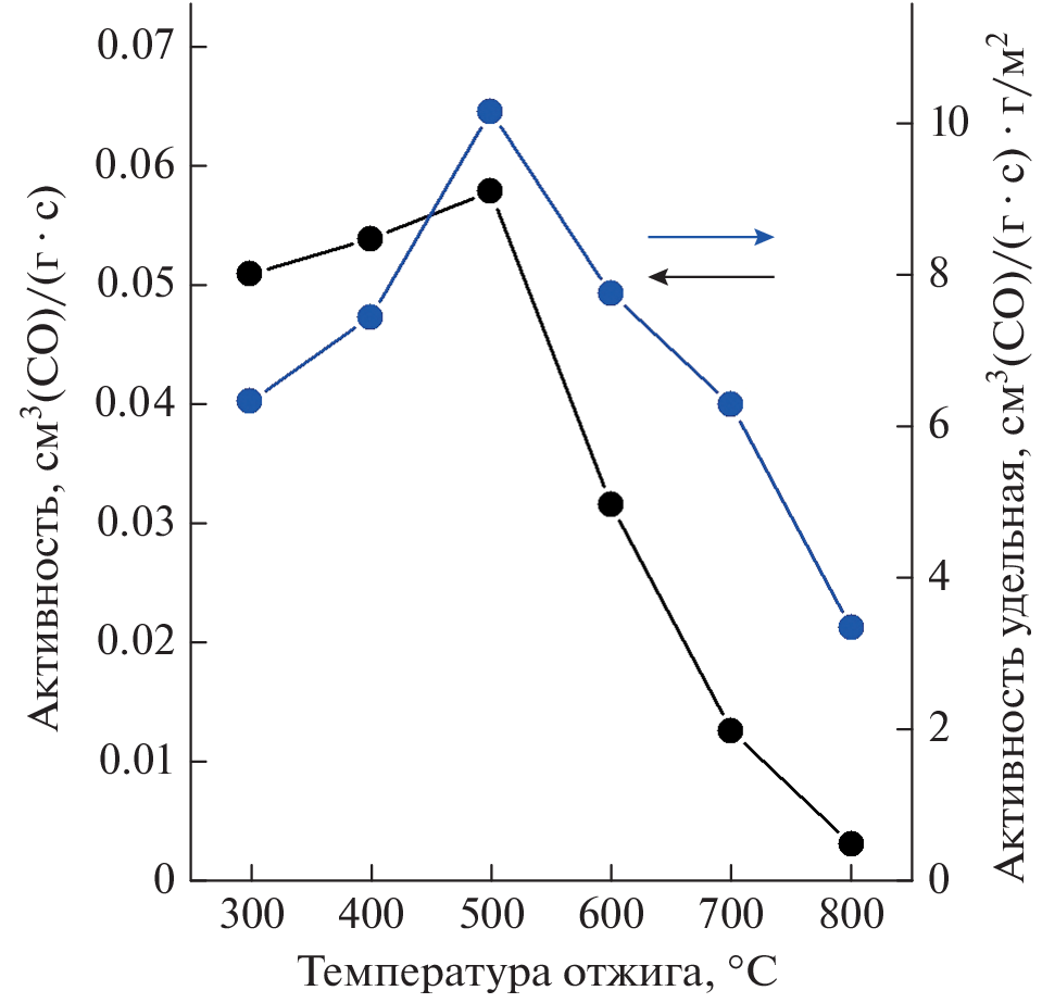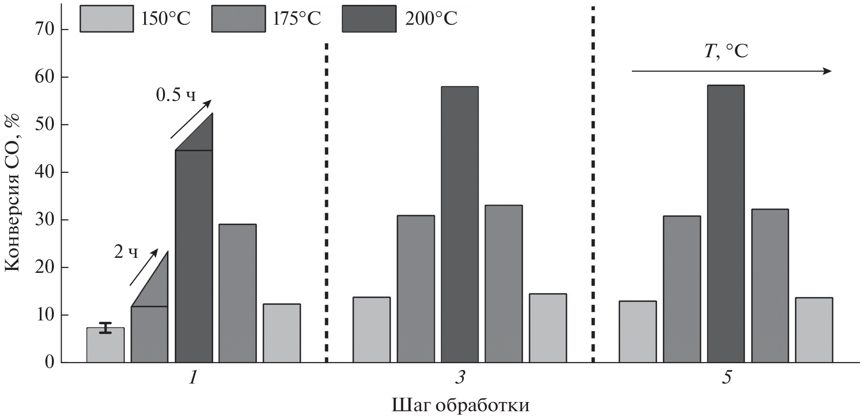A series of MnOx–CeO2 catalysts with a molar ratio of Mn : Ce = 3 : 7 was prepared by co-precipitation method and futher calcination at temperatures ranged from 300 to 800°С. As prepared catalysts were characterized by powder X-ray diffraction, low-temperature nitrogen adsorption, X-ray photoelectron spectroscopy, and the catalytic activity in the CO oxidation reaction was tested for all samples. It has been shown that a (Mn,Ce)O2 solid solution with the fluorite structure is formed for all catalysts. Based on the studies performed, a catalyst obtained at calcination temperature of 600°С was chosen for further studies of the effect of redox exsolution on the catalytic activity in the CO oxidation reaction by operando X-ray diffraction. The experiment was carried out sequentially in a stepwise manner: stepwise heating/cooling in the reaction mixture 1% CO + 2% O2 at temperatures of 150–175–200–175–150°C (stages 1, 3, and 5); reduction of the sample in a mixture of 10% CO + He at 400°C (stage 2); reduction of the sample in a mixture of 10% H2 + He at 400°C (stage 4). It was shown that the reductive pretreatment leads to phase segregation of the initial (Mn,Ce)O2 solid solution and the appearance of dispersed manganese oxides on the surface. In turn, enrichment of the surface with manganese oxide leads to an increase of the activity in the CO oxidation reaction.