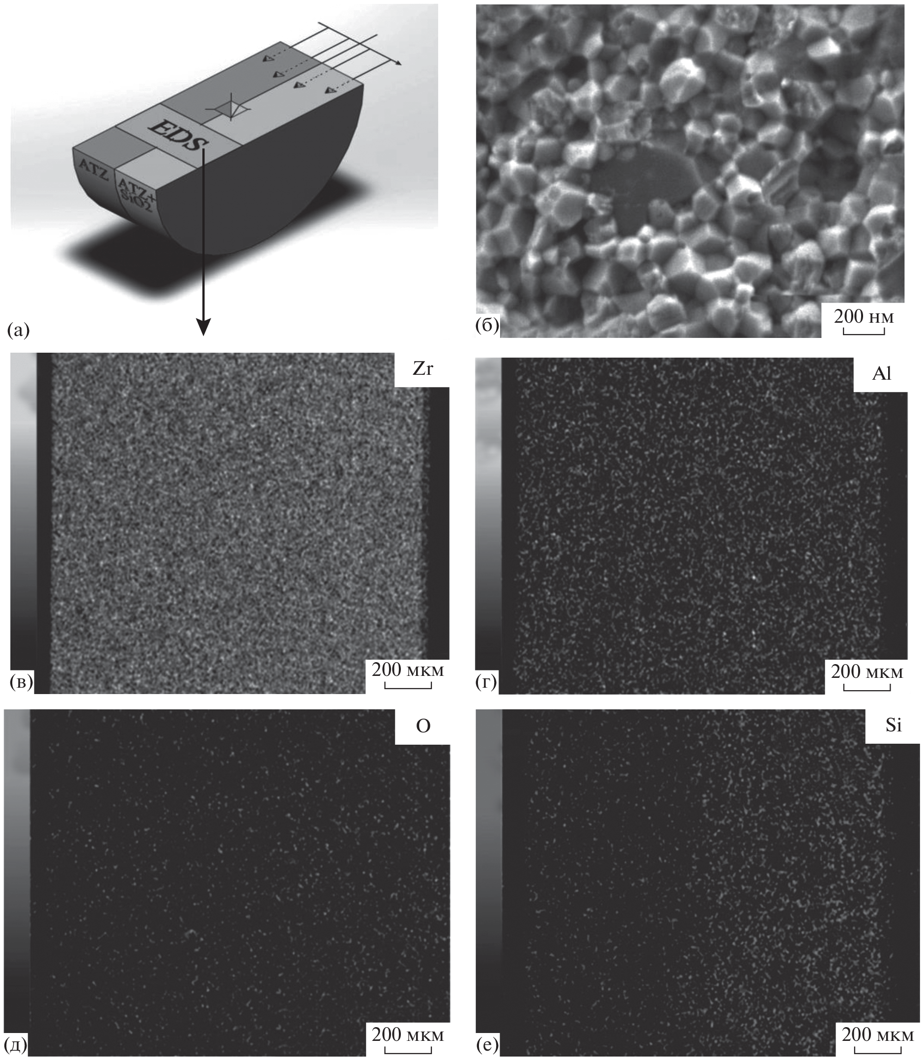 A two-layer alumina toughened zirconia composite ceramic stabilized with calcium oxide (Ca-ATZ) was produced using a relatively economical powder metallurgy method. One of the layers contains silica additive (Ca-ATZ + SiO2). The structure, elemental and phase composition as well as the complex of mechanical properties nearby of the Ca-ATZ/Ca-ATZ + SiO2 interface has been investigated. It was shown that the presence of a sharp interface of layers with different elemental composition did not cause structural disorders (appearance of pores, cracks and other macroscopic defects that contribute to the deterioration of strength properties) or changes in the phase composition (more than 90% of zirconia in both layers was in the tetragonal phase, which provided a high role of the transformation toughening mechanism). Demonstrated preservation of structural integrity and ratio of monoclinic, tetragonal and cubic zirconia phases at formation of sharp interface of the mentioned layers, provides possibility of manufacturing of zirconia-based ceramics with thin (100–200 μm) modified layer. Taking into account the difference in mechanical properties of Ca-ATZ and Ca-ATZ + SiO2 ceramics, this provides the basic material (containing SiO2) increased fracture toughness (not less than 12 MPa m1/2), and near surface layer (not containing SiO2) high hardness (not less than 14 GPa).