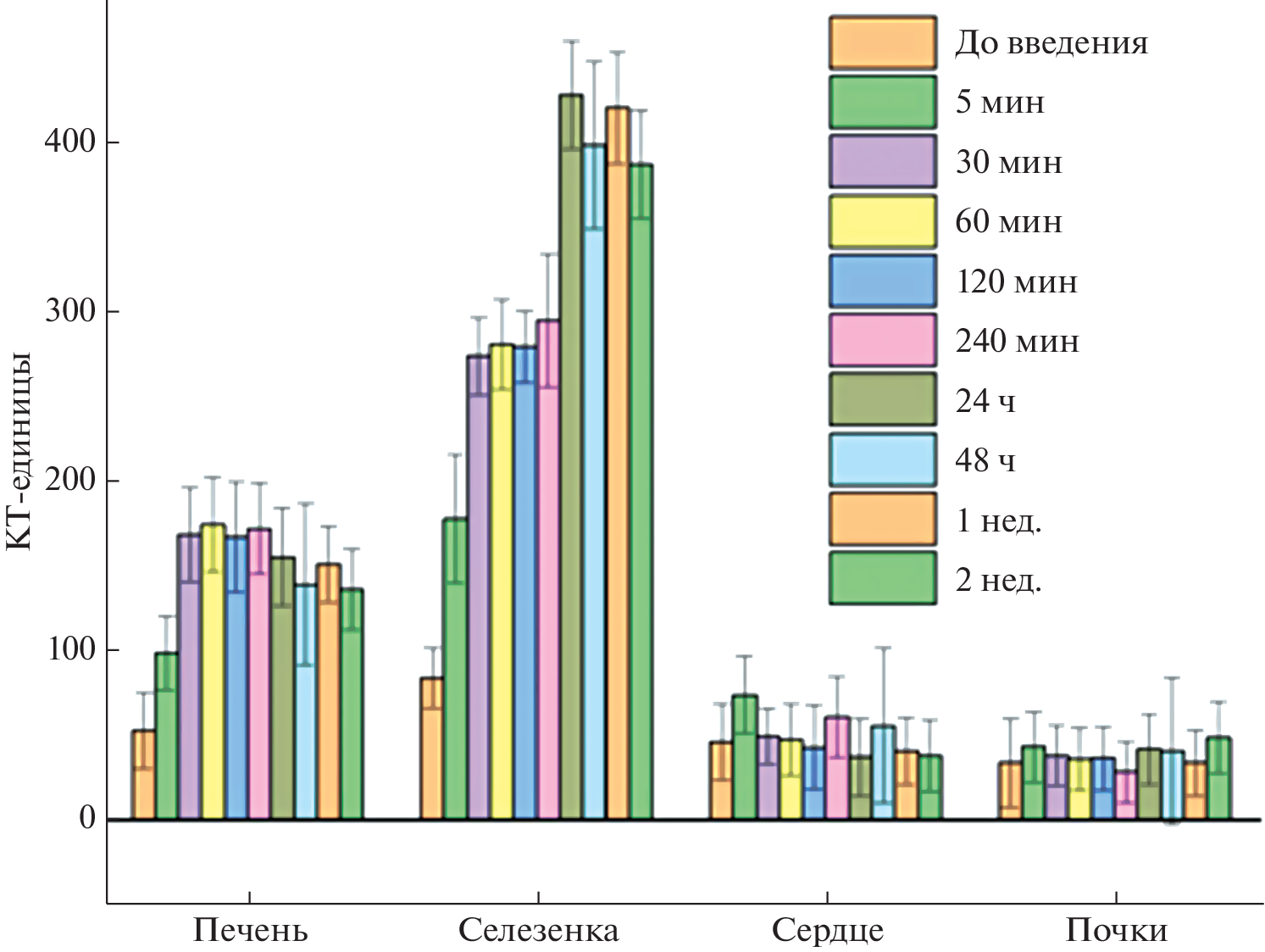 The biodistribution of Gd0.5La0.5F3:Eu(15%) X-ray phosphor nanoparticles in the body and tissues of internal organs of balb/c laboratory mice was studied. Gd0.5La0.5F3:Eu(15%) nanoparticles were obtained by the hydrothermal synthesis at 250°C for 24 h. Using X-ray powder diffraction, transmission electron microscopy, and dynamic light scattering, it was shown that a hexagonal phase was formed in the resulting sample, and the average size of nanoparticles varied in the range 30–40 nm. In vivo experiments have shown that intravenous administration of an aqueous solution of nanoparticles accumulates the sample mainly in the liver and spleen, with the maximum concentration being reached during the first day. According to the results of post-mortem analysis of tissues by micro-CT, it was shown that these nanoparticles formed conglomerates, their distribution over the volume of the organ was homogeneous. X-ray fluorescent analysis of liver and spleen tissue fragments allowed for elemental analysis and mapping. Distribution maps of heavy elements in the composition of nanoparticles (Gd, La, Eu) were similar to Fe distribution maps, which indicated the uniform distribution of Gd0.5La0.5F3:Eu(15%) nanoparticles in the pulp of the internal tissues of the liver and spleen.