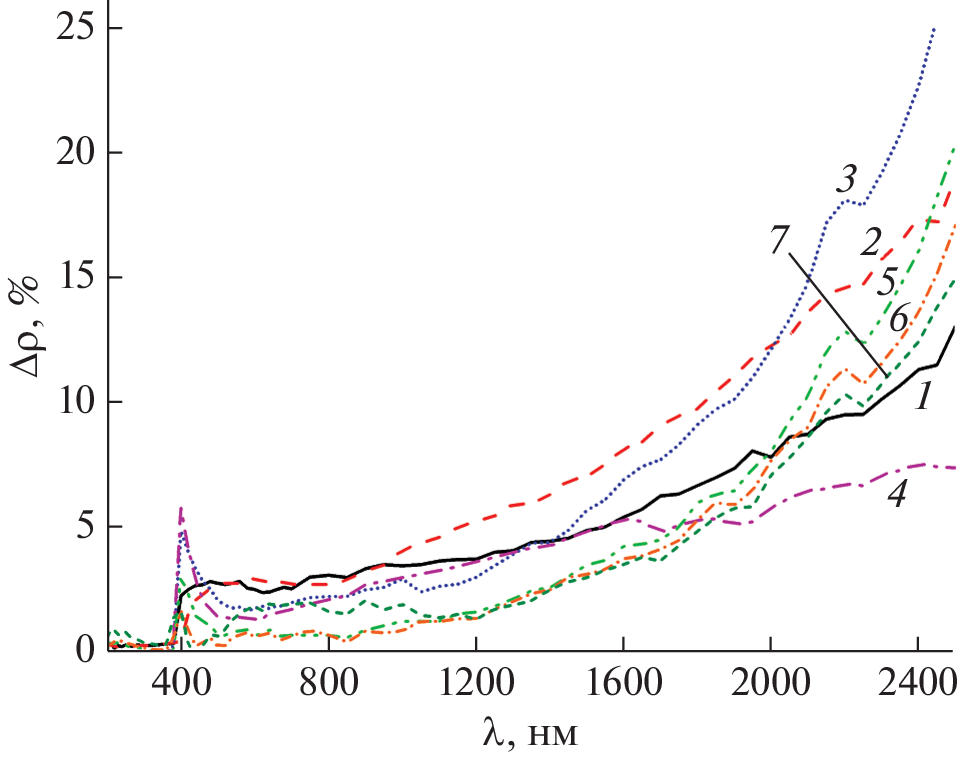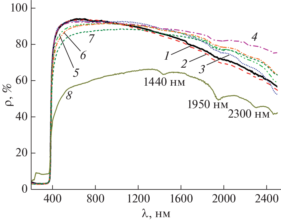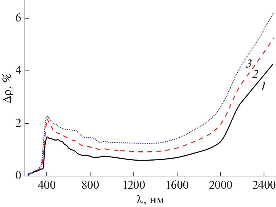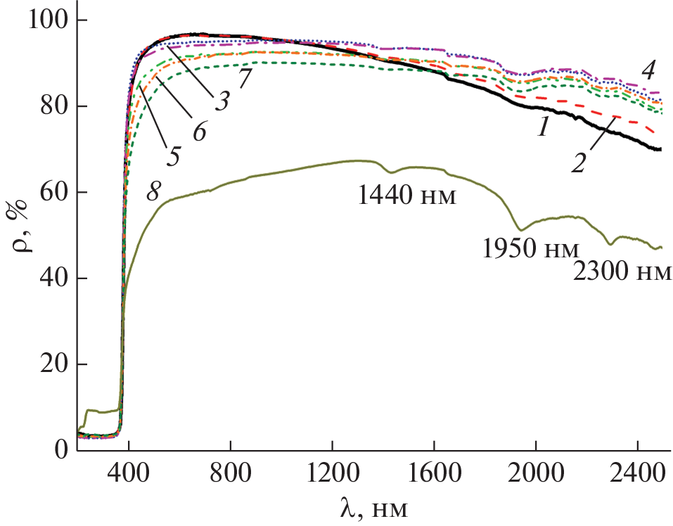 Changes in the diffuse reflectance spectra (∆ρλ) and integral absorption coefficient (Δаs) in the range of 0.2–2.5 µm were studied after modification of zinc oxide powders with few µm particles (mZnO) via own nZnO nanoparticles of various concentrations in the range of 0.1–10.0 wt %. A decrease in the reflection coefficient (ρ) in the range of 0.4–1.0 µm and its increase in the range of 1.0–2.5 µm in the modified mZnO/nZnO powders was established. Electron irradiation (Е = 30 keV, F = 2 × 1016 cm–2) of mZnO, nZnO, and mZnO/nZnO powders with different concentrations of nanoparticles showed that the optimal concentration of nanoparticles is 5 wt %. The radiation stability of the modified powder at this concentration increased by a factor of 2.95, the radiation stability of a nanopowder is more than 2 times higher than that of a powder with particles a few microns in size. When irradiated with electrons all three types of powders form their own point defects, which absorb in the visible region, and free electrons, which absorb in the near-IR region.