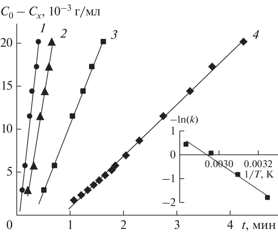 Проведено исследование кинетики выделения водорода при реакции гидролиза водных растворов амминборана с катализаторами на основе кобальта, нанесенных на различные подложки – Co3O4/ZnO, Co/ZnO, Co3O4/цеолит, Co/цеолит, а также использованных в виде порошка Co(OH)2. Определены в каждом случае порядок реакции, константы скорости и кажущаяся энергия активации реакции, скорость выделения водорода в процессе гидролиза в области температур 35–80°С. Во всех случаях использовали раствор амминборана концентрацией 0.078 М. Количество активной части катализаторов определяли химическим методом, оно составляло 7.5–10% от общей массы катализатора. Для низкотемпературного катализатора Co–B и Co(OH)2 кинетические зависимости соответствуют нулевому или близкому к нулевому порядку реакции. При использовании катализаторов Co3O4/ZnO, Co/ZnO, Co3O4/цеолит, Co/цеолит наблюдается первый порядок реакции. Максимальная скорость выделения водорода при 80°С была в случае катализаторов Co/ZnO – 3125 млH2 · (г-кат)–1 · мин–1 (частота оборота TOF = 8.2 мин–1) и Co–B – 3750 млH2 · (г-кат)–1 · · мин–1 (TOF = 11.7 мин–1) соответственно. Рассчитаны значения кажущейся энергии активации реакции каталитического гидролиза амминборана для катализаторов: Со3О4/ZnO – 26.0, Co–B – 44.8, Co(OH)2 черный – 43.4, Co(OH)2 голубой – 47.4 кДж/моль соответственно.