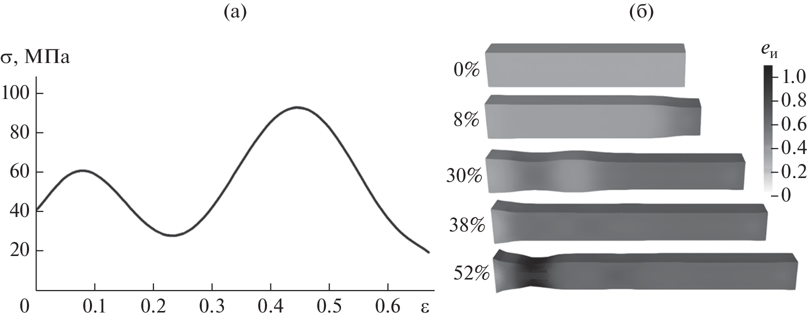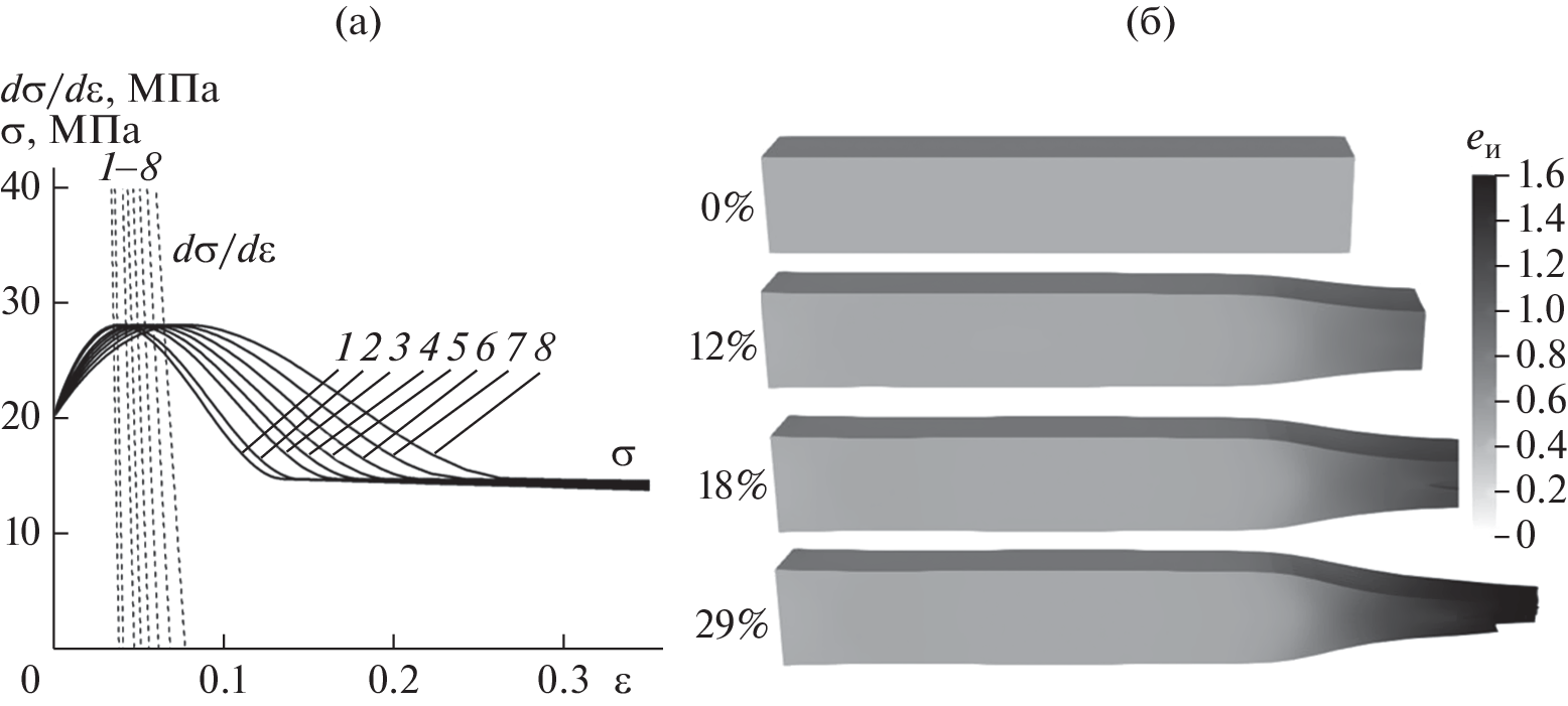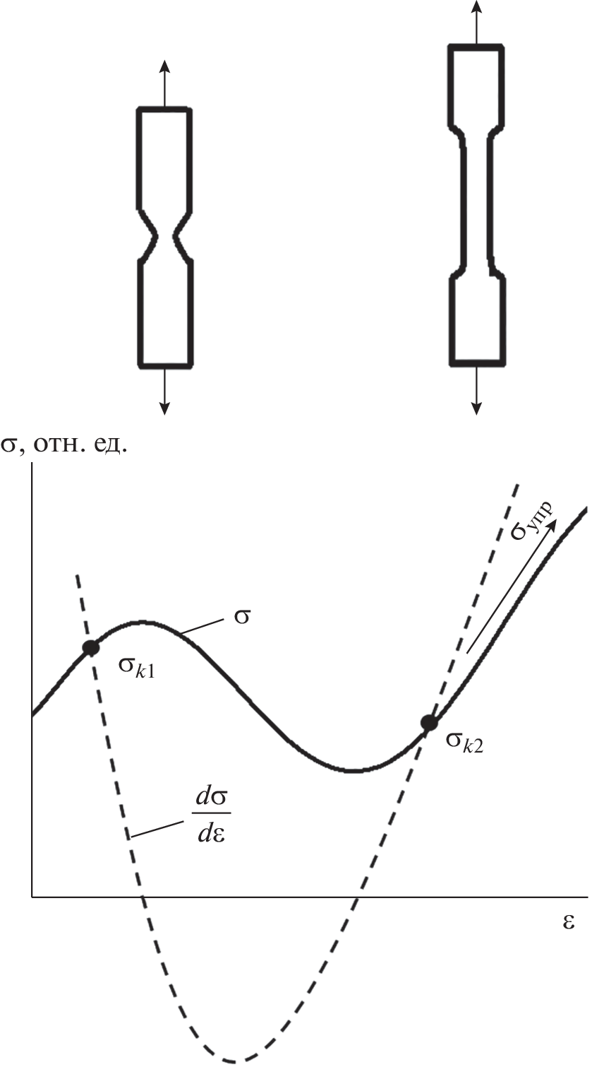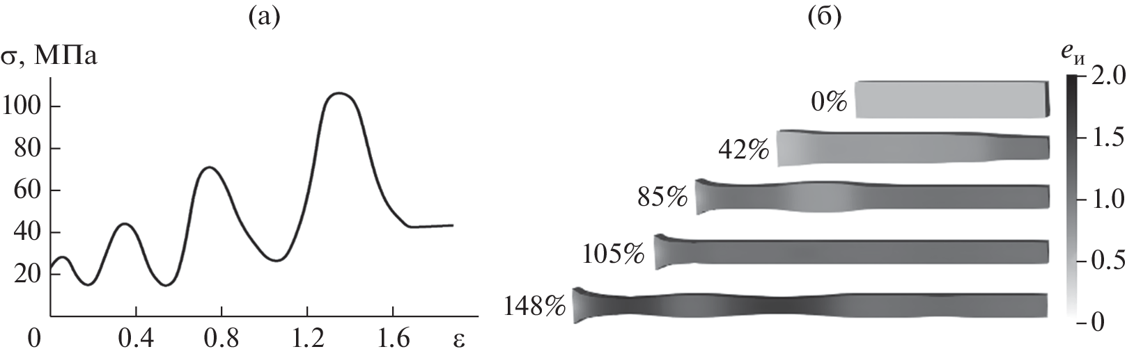 Theoretical study of the phenomenon of superplasticity of metallic materials has been carried out. Numerical calculations were performed on the basis of a two-level finite element model of an elastoplastic medium. The plastic properties of the deformable medium element determining the deformation by uniaxial tension in superplasticity mode were found. It was shown that depending on the shape of the stress-strain curve (σ–ε) of the medium element, the various types of plastic flow localizations were observed at the macroscale level. The nonmonotonic dependence σ–ε of the deformable medium element having single maximum was determined as the condition for the appearance of a stable fracture neck. In the case when the dependence σ–ε characterized by the strengthening of the elementary volumes with two maxima, a propagating (running) neck was observed, then a second (counter) neck appeared, while further tension led to the appearance of the third stable neck in which fracture occurred. In the case of more complex oscillating shape of σ–ε curve the multiple running necks were observed. The movement of the multiple necks propagating along the sample leads, ultimately, to a uniform picture of the deformation and made it possible to achieve the strain values observed in superplasticity mode.