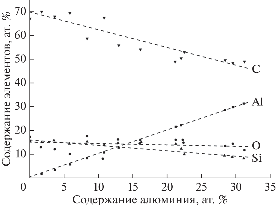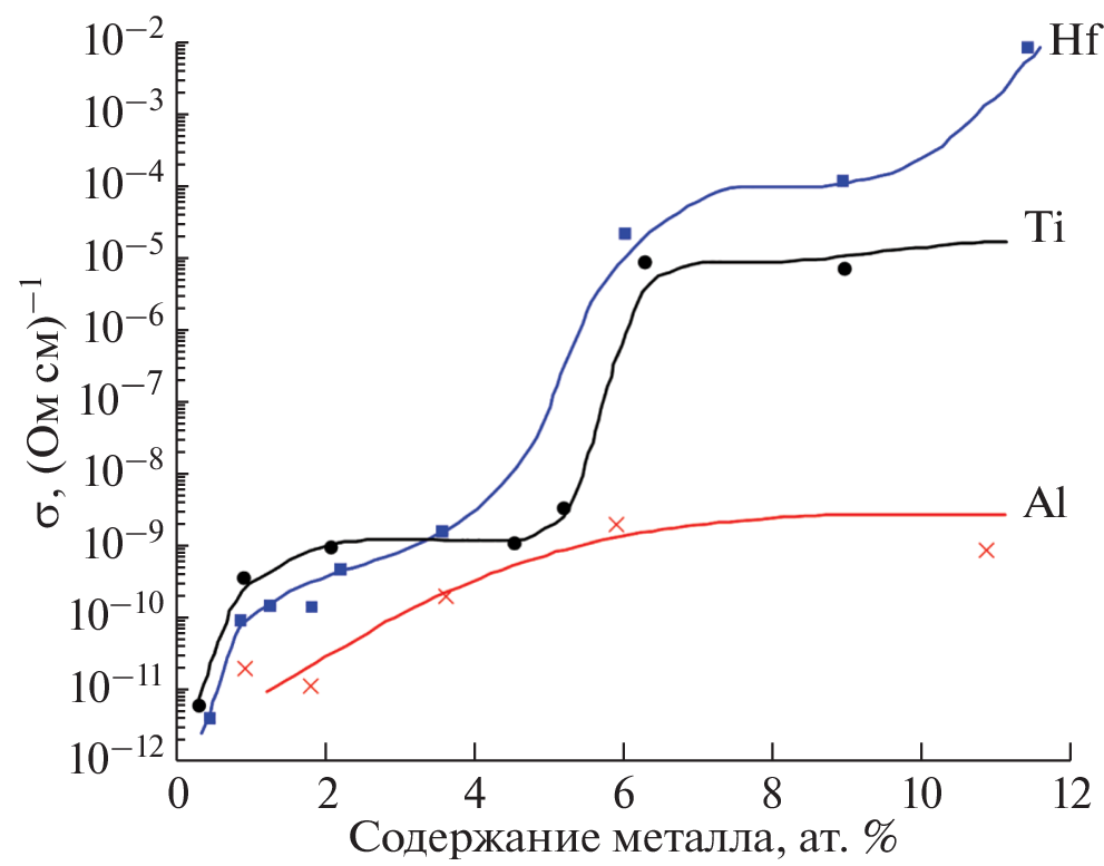 This article studies the influence of aluminium, a weak-carbide-forming metal, on phase composition, structure, and electro physical properties of amorphous diamond-like silicon-carbon films. The results of this study are compared with the influence on the same characteristics of strong-carbide-forming transition metals – titanium and hafnium. It is shown that the effects of aluminium and transition metals on the structure and properties of silicon-carbon films are fundamentally different. The addition of aluminium in a wide range of concentrations, in contrast to transition metals, does not lead to formation of a nano-crystalline phase in the films. The dependence of electrical conductivity on the aluminium concentration is smooth and monotonic, but in the case of transition metals, it has a pronounced percolation form. In addition, the absolute values of changes in electrical conductivity differ by orders of magnitude. The performed studies allowed us to conclude that the reasons for these differences are due to the interaction of metals with different chemical elements of the film. Transition metal atoms interact mainly with carbon atoms to form nanocrystals of highly conductive carbides. In contrast, aluminium atoms mainly interact with oxygen atoms and form an amorphous phase of aluminium oxide.