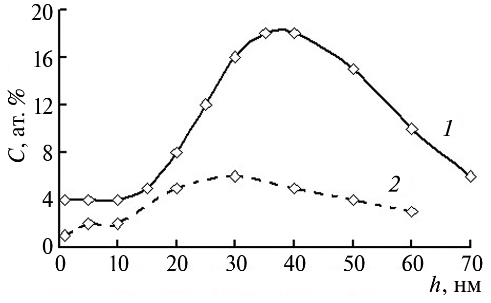 Отмечаемые выше уменьшения интегрального содержания углерода и азота в образце после термического воздействия можно объяснить следующим образом. Углерод при достаточно высоких температурах в атмосфере кислорода или азота вступает в реакцию горения с образованием летучих соединений СО, СО2 или (СN)2 [23]. По всей видимости, при термическом воздействии кислород из остаточной атмосферы вакуума и из переходной области взаимодействует с углеродом из слоя с преимущественной концентрацией, а также с углеродом и азотом из переходной области, образуются соединения СО, СО2 и (СN)2, которые покидают поверхность образца, уменьшая концентрацию углерода и азота.