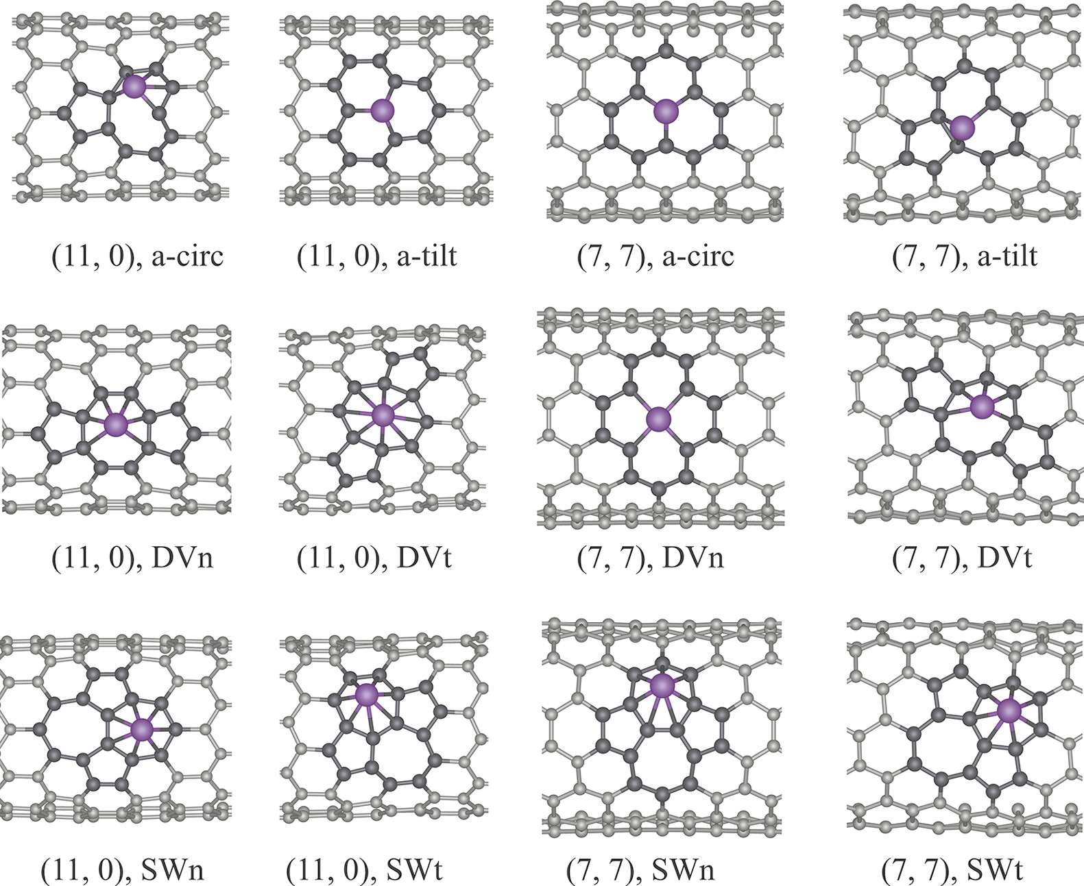 Равновесная атомная структура комплексов дефектной нанотрубки с атомом титана приведена на рис. 2. Обозначения типов структурных дефектов: a-circ – одиночная вакансия, в отсутствие атома сорбента представляет собой два сочлененных кольца из пяти и восьми атомов углерода (кольца 5–8), ось симметрии дефекта параллельна оси трубки; a-tilt – то же, что и a-circ, только ось дефекта наклонена относительно оси трубки на некоторый угол; DVn – двойная вакансия, симметричная структура из трех колец (кольца 5–8–5), с осью симметрии, параллельной оси трубки; DVt – то же, что и DVn, только ось дефекта наклонена относительно оси трубки; SWn – топологический дефект Стоуна–Вэллса, два кольца типа 5–7 с осью симметрии, параллельной оси трубки; SWt – то же, что и SWn, только ось симметрии наклонена к оси трубки.