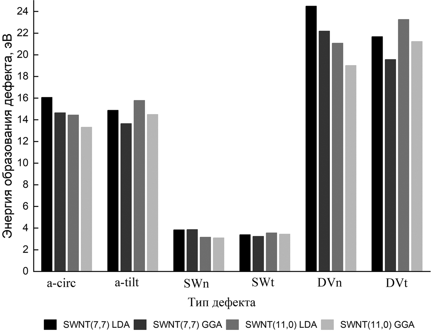 Значения энергии образования дефектов приведены на рис. 3. Видно, что главным фактором, определяющим энергию образования дефекта, является его тип. Независимо от выбора остальных факторов (вида трубки, приближения LDA/GGA и ориентации дефекта) наименьшей энергией характеризуется топологический дефект Стоуна–Уэйльса. Усредненная по всем упомянутым факторам энергия образования этого дефекта <Ed(SW)> = 3.45 эВ, а разброс ΔEd(SW) составляет ±0.4 эВ. Наибольший вклад в разброс вносят тип трубки и ориентация дефекта, тогда как выбор приближения LDA/GGA не столь важен. Для дефекта одиночной вакансии имеем <Ed(a)> = 14.66 эВ и Ed(a) = ±1.4 эВ. В этом случае в указанную неопределенность все три фактора могут вносить примерно одинаковый вклад. Последнее справедливо и для дефекта двойной вакансии, для которого <Ed(DV)> = 21.56 эВ, Ed(DV) = ±(2.6–2.9) эВ. Таким образом, можно констатировать, что энергию образования дефектов всех рассмотренных типов (Стоуна–Уэйльса, одиночной и двойной вакансии) можно предсказать с точностью 10–12%, не интересуясь типом трубки, ориентацией дефекта и не заботясь о “правильном выборе” обменно-корреляционного функционала. Если первые два фактора известны, то неопределенность предсказаний ΔEd(DV) можно уменьшить, но не радикально, поскольку неизвестно, как сделать упомянутый “правильный выбор”.