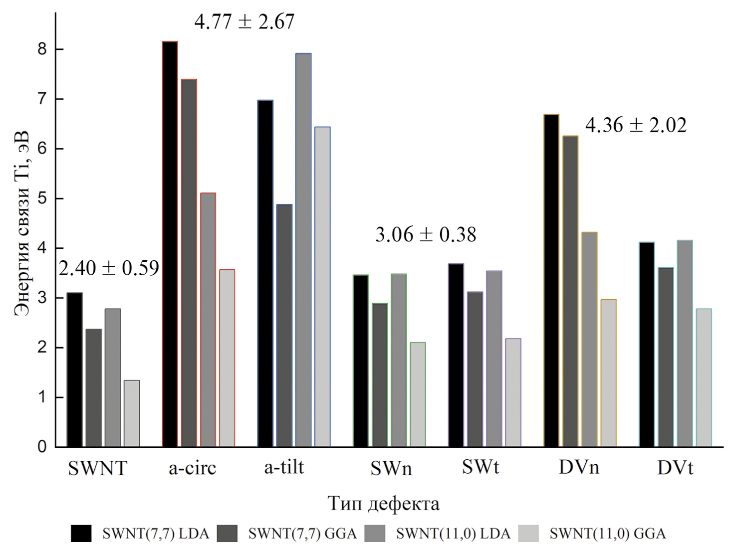 где ECNT+Ti – энергия нанотрубки с адсорбированным атомом титана, ECNT+Ti – энергия нанотрубки либо совершенной (ECNT = ECNT(pure)), либо содержащей дефект (ECNT = ECNT(def)), ETi – энергия атома титана.