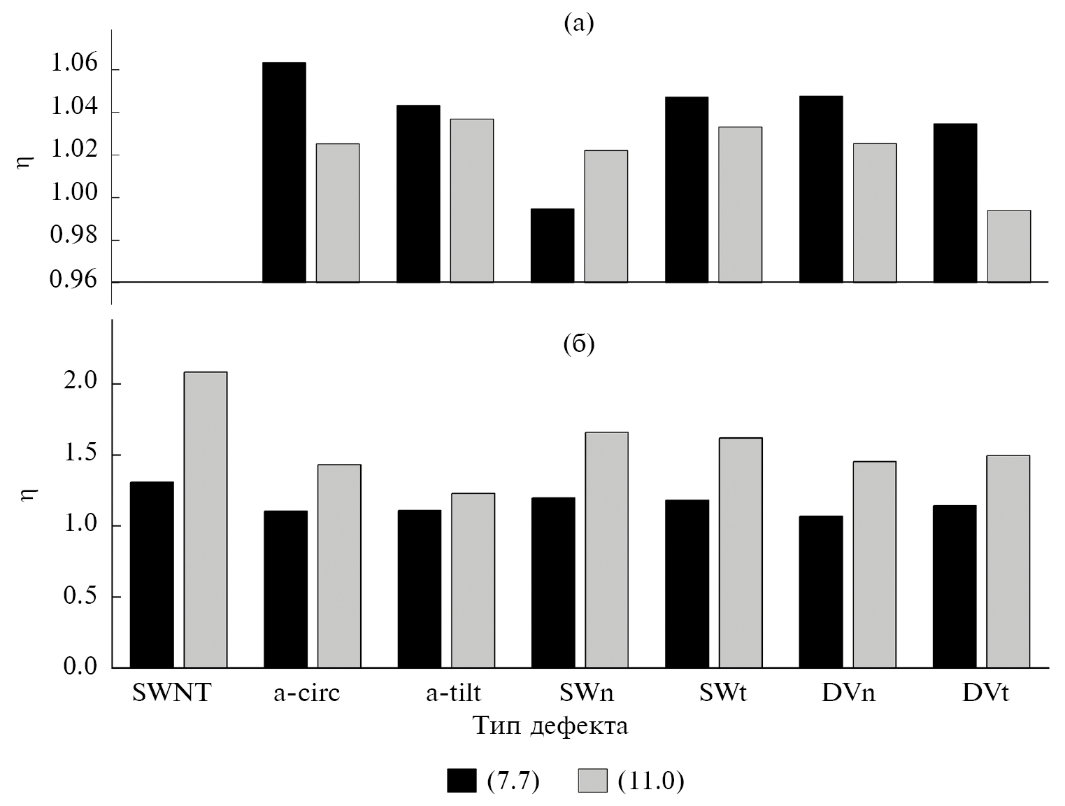 Основной вклад в эту неопределенность вносит, по-видимому, последний из упомянутых ее источников. Если зафиксировать тип трубки, тип дефекта и его ориентацию и сравнить оценки энергии образования дефектов и энергии связи атомов Ti, полученные с помощью приближений LDA и GGA, посчитав их отношение η = ELDA/EGGA, то получим результаты, представленные на рис. 5. Видно, что для энергии образования дефектов 1.0 ≤ η ≤ 1.11, причем в случае дефектов Стоуна–Уэйльса η ближе к нижней границе и даже достигает ее, а в случае остальных – ближе к верхней границе. Для энергии связи атомов Ti c совершенными участками поверхности УНТ и с дефектами на ней результат менее утешительный: здесь интервал для η зависит от типа трубки и составляет 1.07 ≤ η ≤ 1.43 для трубки (7, 7) и 1.23 ≤ η ≤ 2.07 для трубки (11, 0). В связи с этим возникает вопрос: каким образом симметрия трубки влияет на взаимоотношения между приближениями LDA–GGA? Заметим, что значение η = 2.07 достигается на совершенной трубке (11, 0). Это можно было бы объяснить тем, что энергия связи Ti c совершенной трубкой мала, и поэтому велика роль погрешностей разного рода в ее подсчете. Однако энергия связи Ti с дефектами Стоуна–Вэллса лишь немного больше, но величина η для них не столь вызывающе велика.
