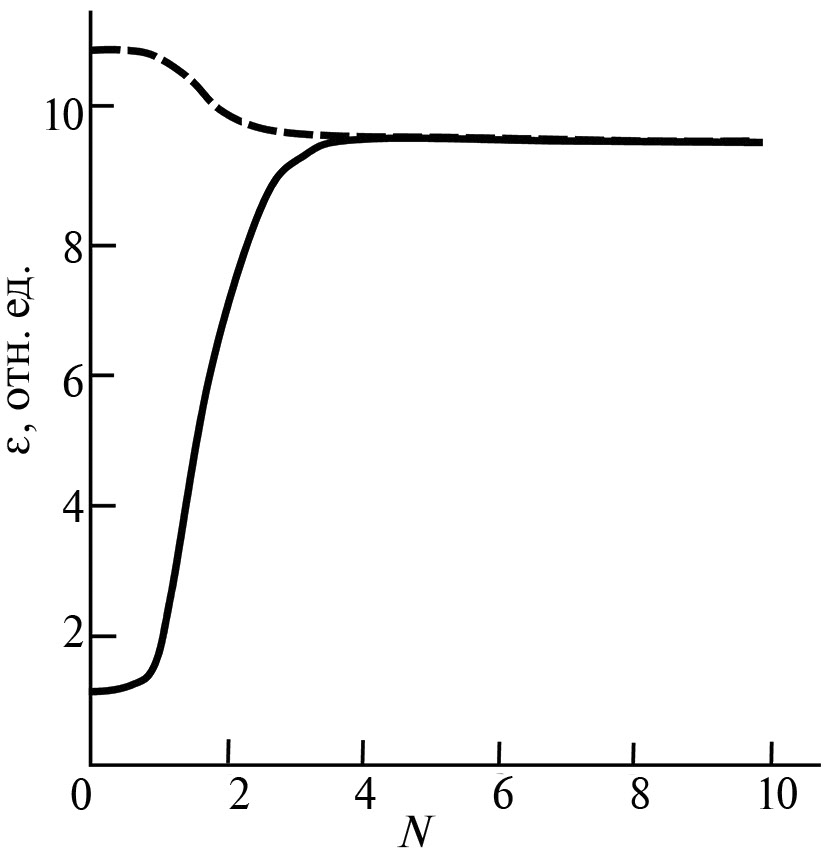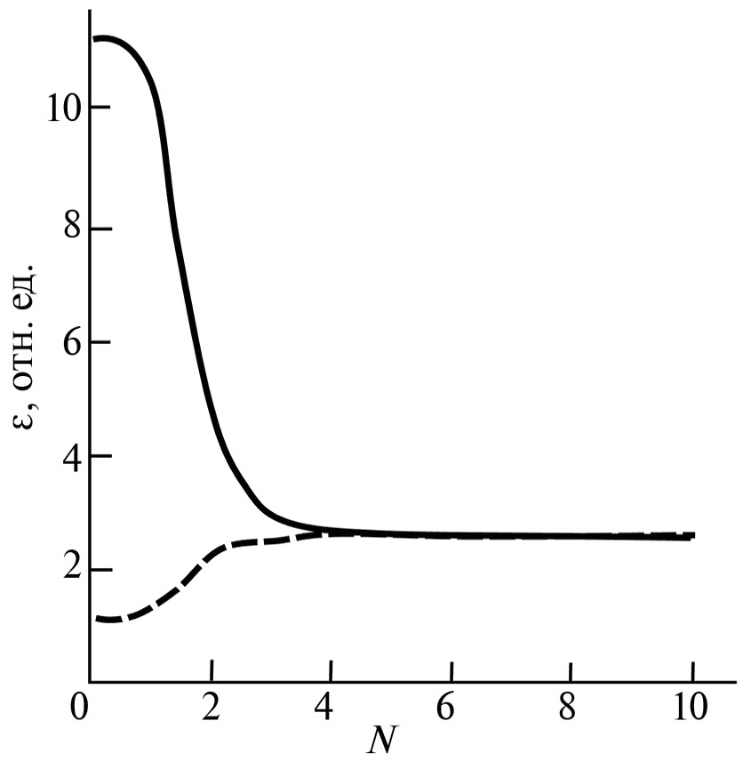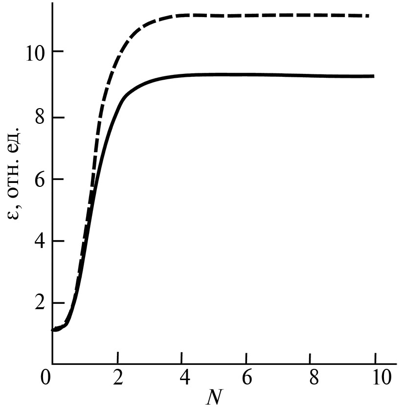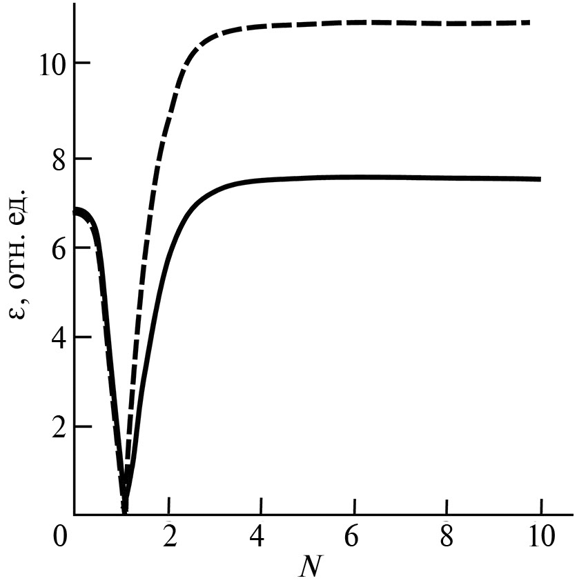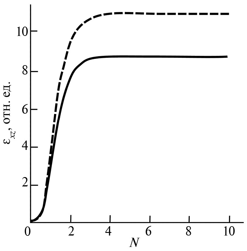 Рис. 3. Зависимость сдвиговой деформации от числа оборотов в случае θ1 > 0, θ2 > 0, температура отжига: 570 (сплошная линия); 950°С (штриховая линия).