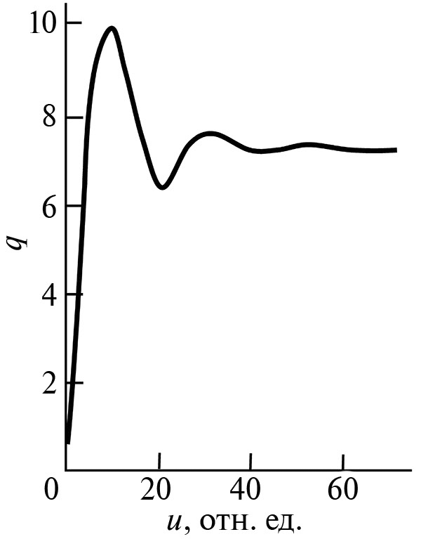 где q – структурный параметр порядка (изменение одного из линейных размеров элементарной ячейки), φ – плотность дефектов, M – момент кручения, направленный по оси z, α, β, γ, θ – феноменологические константы, слагаемое с коэффициентом γ3 описывает флуктуации распределения компонент тензора деформации, Φ1 – вид этого слагаемого, зависит от поставленной задачи и будет конкретизирован позже. Как показано в [10], зависимость величины момента от числа оборотов N описывается функцией гиперболического тангенса. Конкуренция слагаемых в круглых скобках обеспечивает появление длиннопериодической структуры при наложении кручения под высоким давлением.