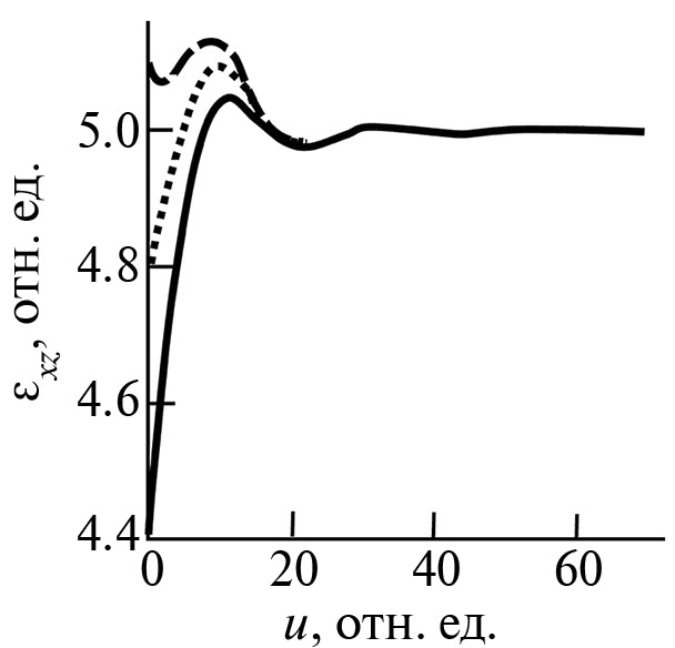 Эта задача является краевой задачей первого рода (задача Дирихле). В процессе численного расчета, проведенного с помощью математического пакета MatLab R2022a, она сводилась к краевой задаче третьего рода. Вычисления показали, что форма кинка при учете взаимодействия двух параметра порядка практически не меняется, но размах колебаний несколько уменьшается. На рис. 7 показана форма кинка, вычисленного исходя из системы (11). Видно, что форма не меняется по сравнению с расчетами [9]. На рис. 8 приведены зависимости εxz(u) при разных начальных условиях. Необходимо отметить, что по отношению к неподвижной системе координат движение кинка происходит слева направо, т.е. с левой стороны находится конечное состояние после наложения кручения под высоким давлением, а справа – начальное. При этом нужно учесть, что зависимость εxz(u) также носит колебательный характер, сильно зависящий от левого граничного условия. Количество и размах колебаний на начальном этапе уменьшаются при приближении левого краевого условия к начальному состоянию. Из рис. 8 видно, что поведение кривой, описывающей компоненту тензора деформации, зависит от того, выше или ниже конечное состояние по отношению к начальному.