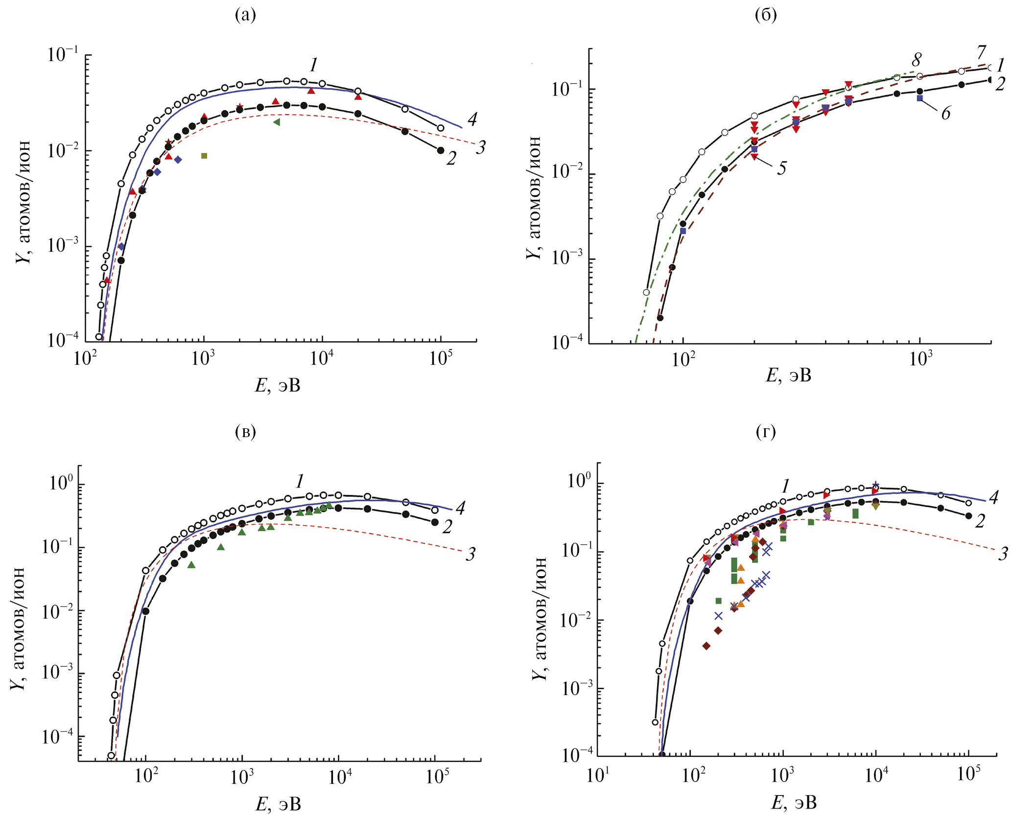 Расчеты группы Экштайна [18], выполненные для плоскостного потенциального барьера, лежат межу нашими предельными кривыми и, на наш взгляд, несколько завышают коэффициенты распыления. Как видно из рис. 1б, наши расчеты для случая Be–W неплохо согласуются с расчетами, выполненными методами молекулярной динамики [19, 20], и расчетом Ямамуры [21] и программой SDTrimSP [22].
