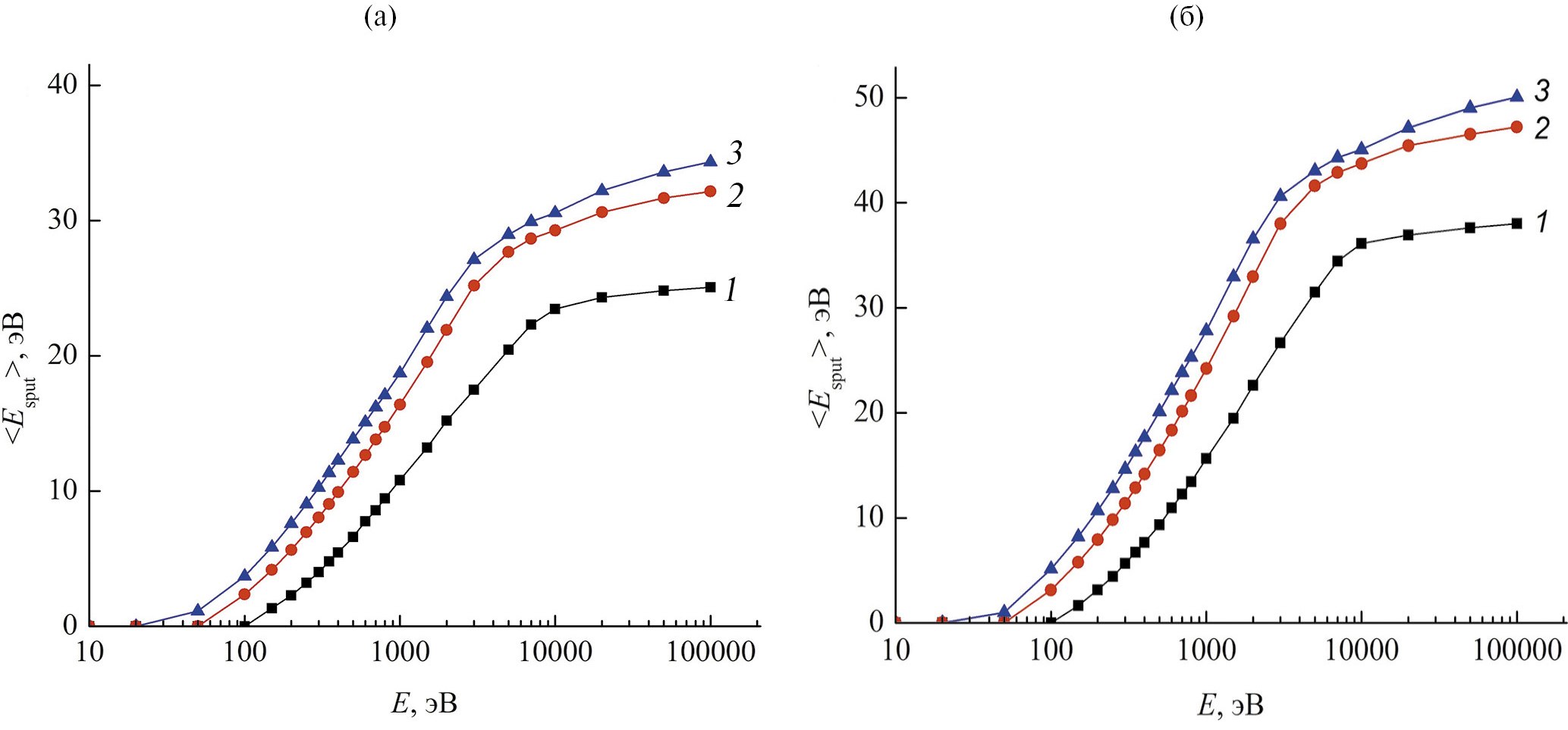 Рис. 2. Зависимость средней энергии распыленного атома вольфрама от начальной энергии бомбардирующей частицы при облучении атомами Не (1), Be (2) и N (3) в случае сферического (а) и плоскостного поверхностного барьера (б).