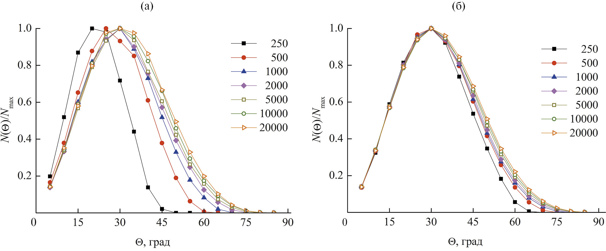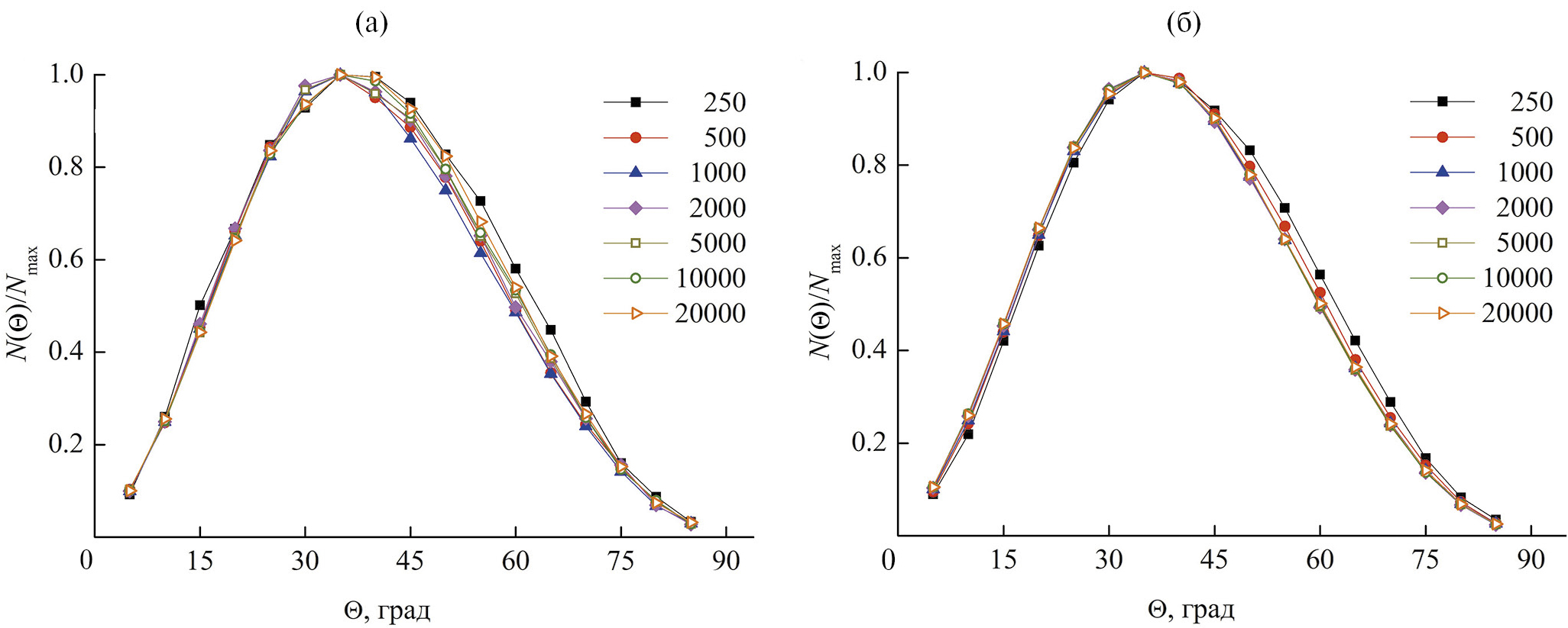 Рис. 3. Нормированное угловое распределение распыленных частиц He (а) и N (б) с различной энергией (указана на графике в эВ) в случае сферического поверхностного потенциального барьера.