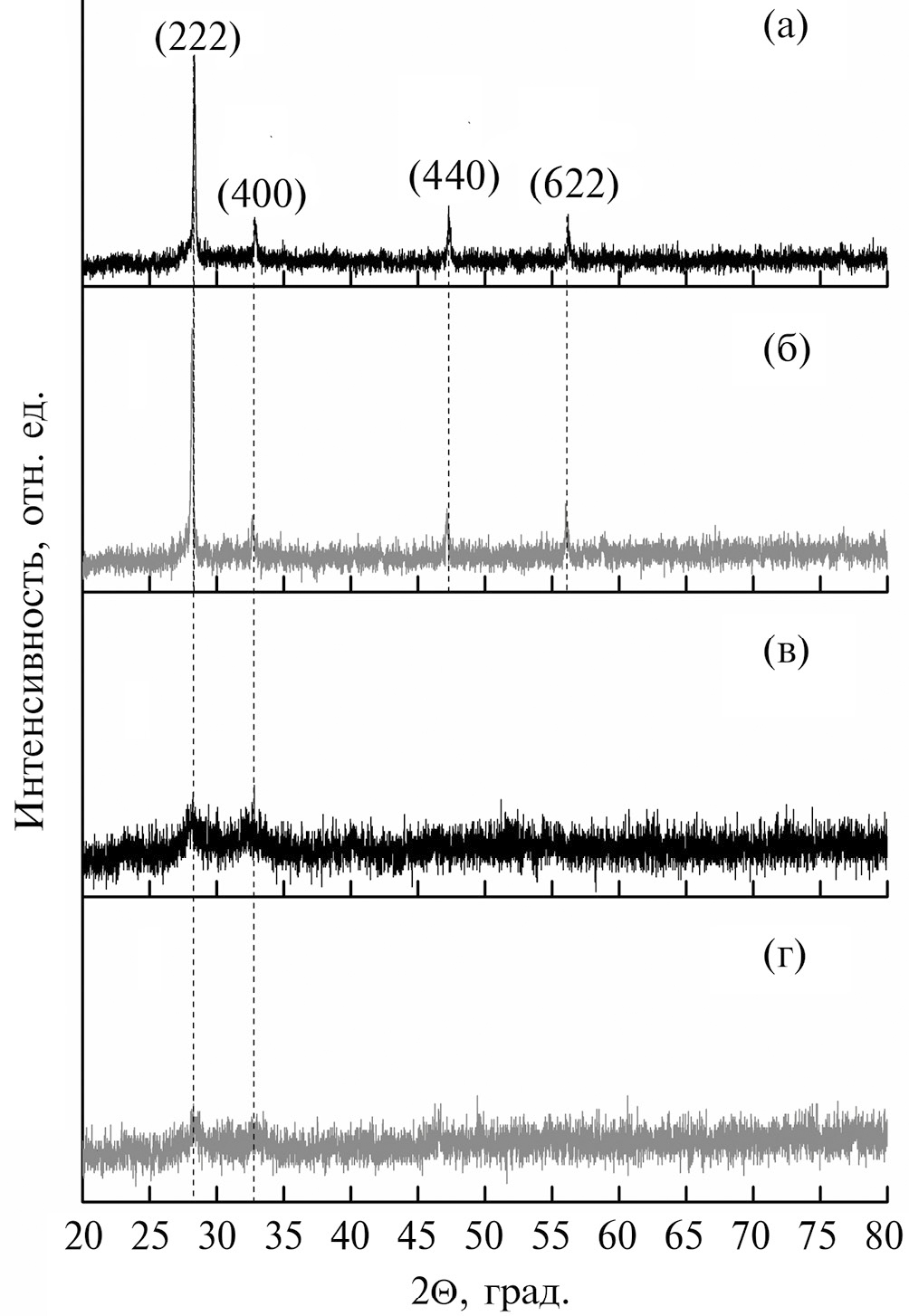 Рис. 1. Рентгенограммы порошков: mGd2O3 до (а) и после (б) облучения электронами, nGd2O3 до (в) и после (г) облучения электронами.