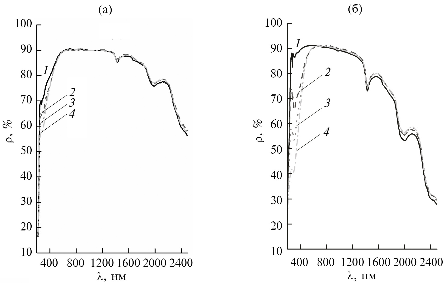 Сравнение спектров ρλ порошков после облучения показывает (рис. 5), что уменьшение отражательной способности происходит в основном в УФ и видимой областях спектра. В нанопорошке изменения значительно больше по сравнению с микропорошками. В ближней ИК области изменения незначительные. Интенсивность полосы поглощения при 1400 нм не изменяется, полосы при 1940 нм – уменьшается. Следует отметить, что в спектре нанопорошка уменьшение более значительное по сравнению с микропорошком.
