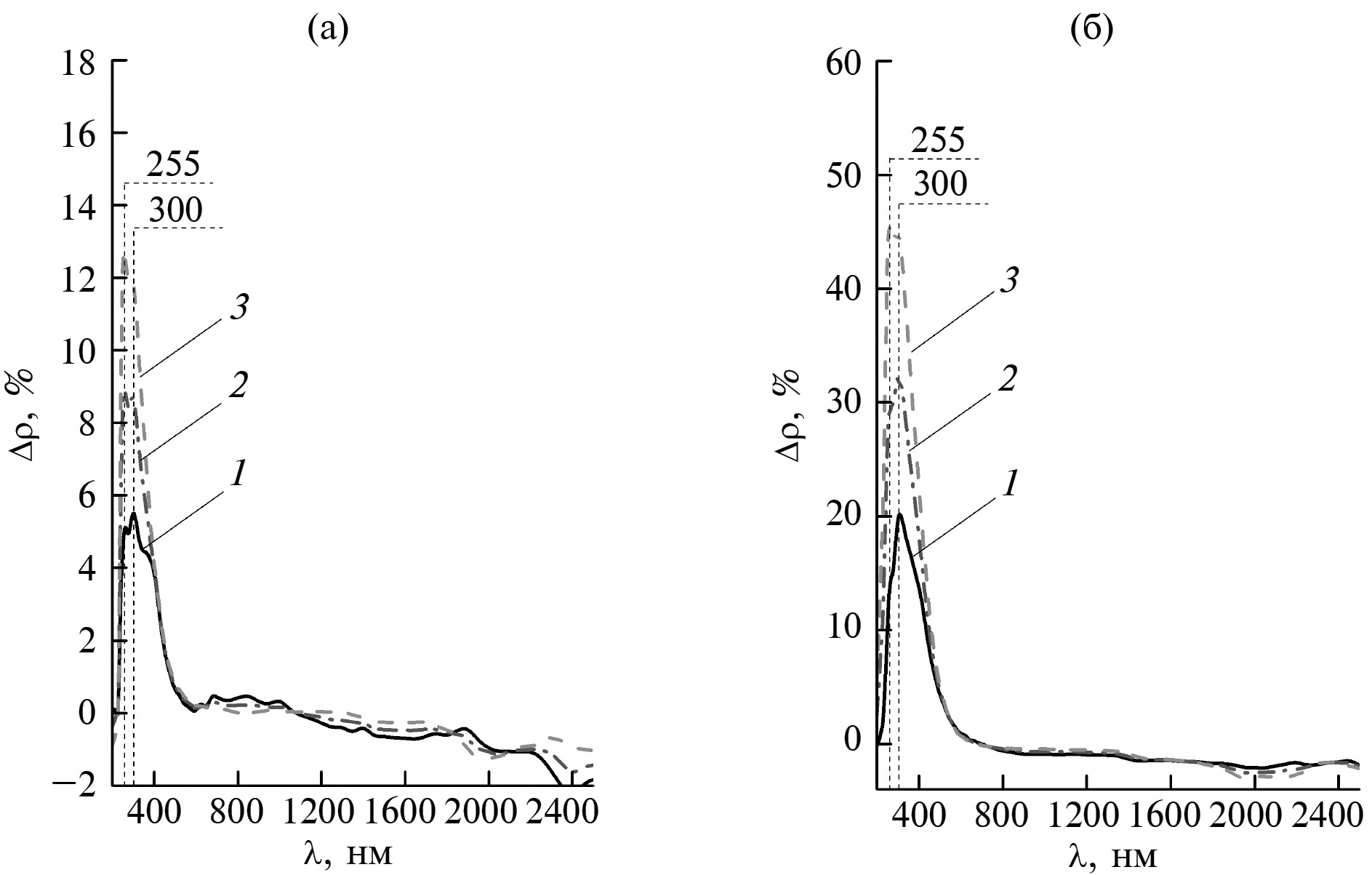 Из разностных спектров диффузного отражения (рис. 6) следует, что облучение приводит к появлению двух полос поглощения при 255 и 300 нм в спектрах ∆ρλ обоих типов порошков. Интенсивность обеих полос в спектре нанопорошка Gd2O3 более чем в три раза превышает интенсивность соответствующих полос в спектрах микропорошка. Соотношение значений ∆ρ полосы при 255 нм при различном флуенсе электронов следующее: 20 : 5.1 = 3.92 (Ф = 1 × 1016 см–2); 32 : 8.8 = 3.64 (Ф = 2 × 1016 см–2); 45 : 12.8 = 3.52 (Ф = 3 × 1016 см–2), т.е. уменьшается с увеличением флуенса электронов. В ближней ИК области отражательная способность после облучения порошков незначительно (на 1–2%) увеличивается. Увеличение близко к ошибке определения коэффициента отражения в этой области.