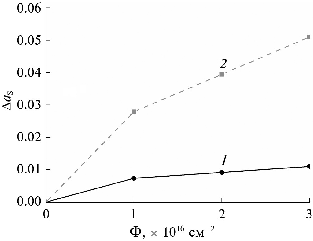 Рис. 7. Зависимость изменения коэффициента поглощения ∆as от флуенса электронов для mGd2O3 (1) и nGd2O3 (2).