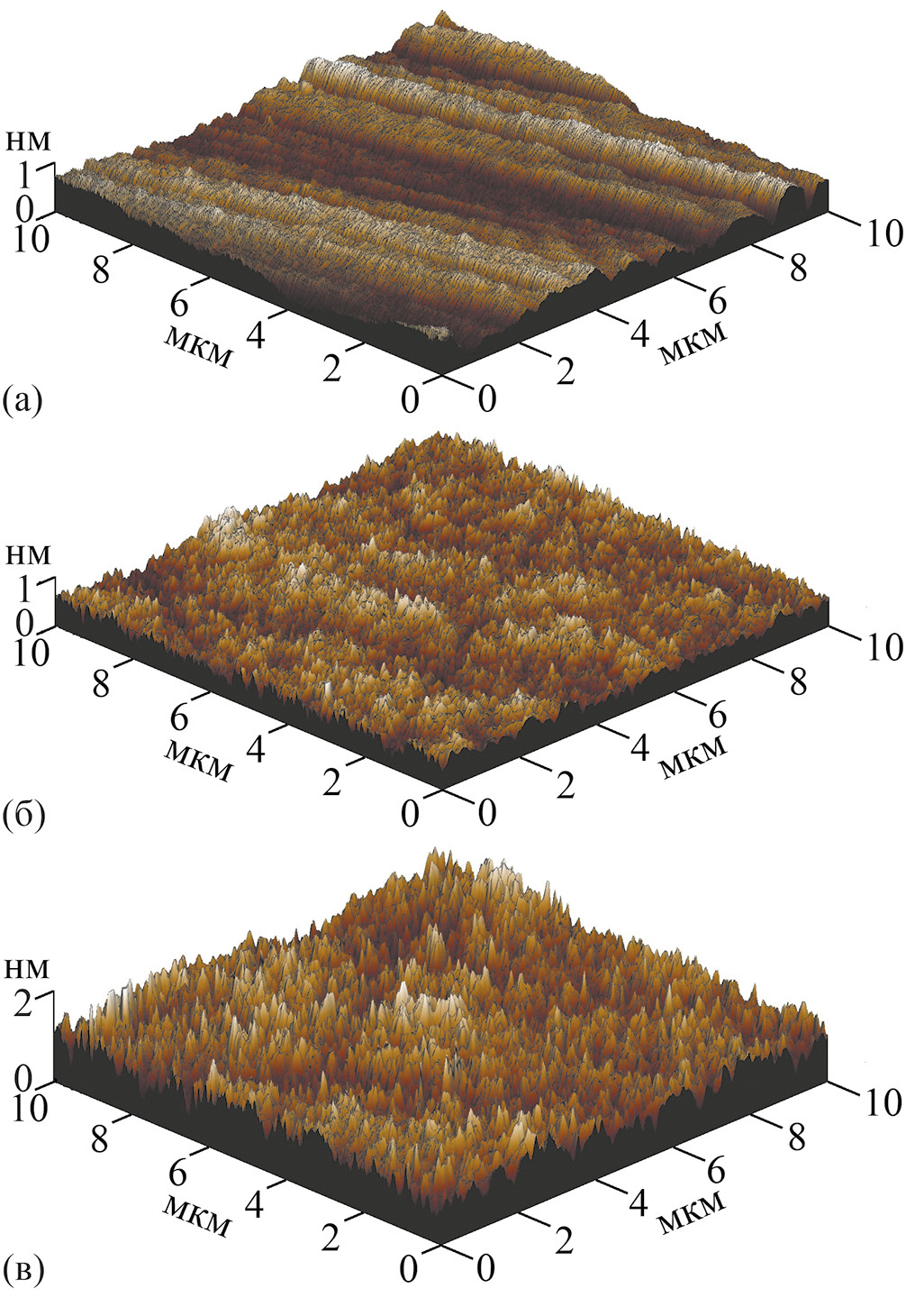 Рис. 1. АСМ-изображения поверхности 10 × 10 мкм монокристалла KGW:Nd: а – исходной; б – после обработки низкоэнергетическими кластерными ионами аргона; в – после обработки высокоэнергетическими кластерными ионами аргона.
