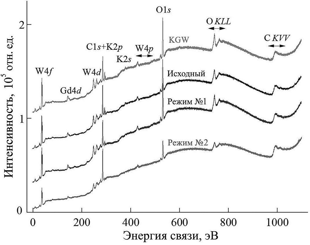 На рис. 2 продемонстрированы рентгеновские фотоэлектронные спектры исходной и обработанных поверхностей калий-гадолиниевого вольфрамата, легированного ионами неодима. Там же для сравнения показан спектр монокристалла чистого KGd(WO4)2. Как после низкоэнергетической, так и после высокоэнергетической обработки наблюдается значительное снижение интенсивности пика калия и небольшое уменьшение интенсивности пика гадолиния. Снижение концентрации атомов калия после обработки можно объяснить преимущественным распылением калия как более легкого химического элемента, что также наблюдается в фотоэлектронных спектрах образцов боридов, нитридов и оксидов металлов [32]. Как отмечается в [32], в результате ионного облучения происходит ионно-стимулированное смешение атомов и образование субстехиометрических стабильных фаз. Дополнительно можно отметить, что снижение концентраций как калия, так и гадолиния может быть связано со структурой монокристалла KGW:Nd. Как показано в [33], атомы калия и гадолиния слабо связаны в кристаллической решетке KGW:Nd в отличие от сильно связанных соеднинений W–O.