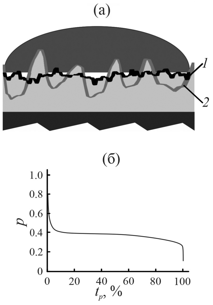 Рис. 6. Модель бигауссовой поверхности пленки на твердой (диэлектрической) подложке, смачивание которой идет по механизму Касси–Бакстера: а – схема, иллюстрирующая суперпозицию компонент профиля поверхности и их вклад в общую топографию (кривые 1 и 2 моделируют нижнюю и верхнюю гауссианы топографического нанорельефа); б – типичная опорная кривая профиля поверхности.