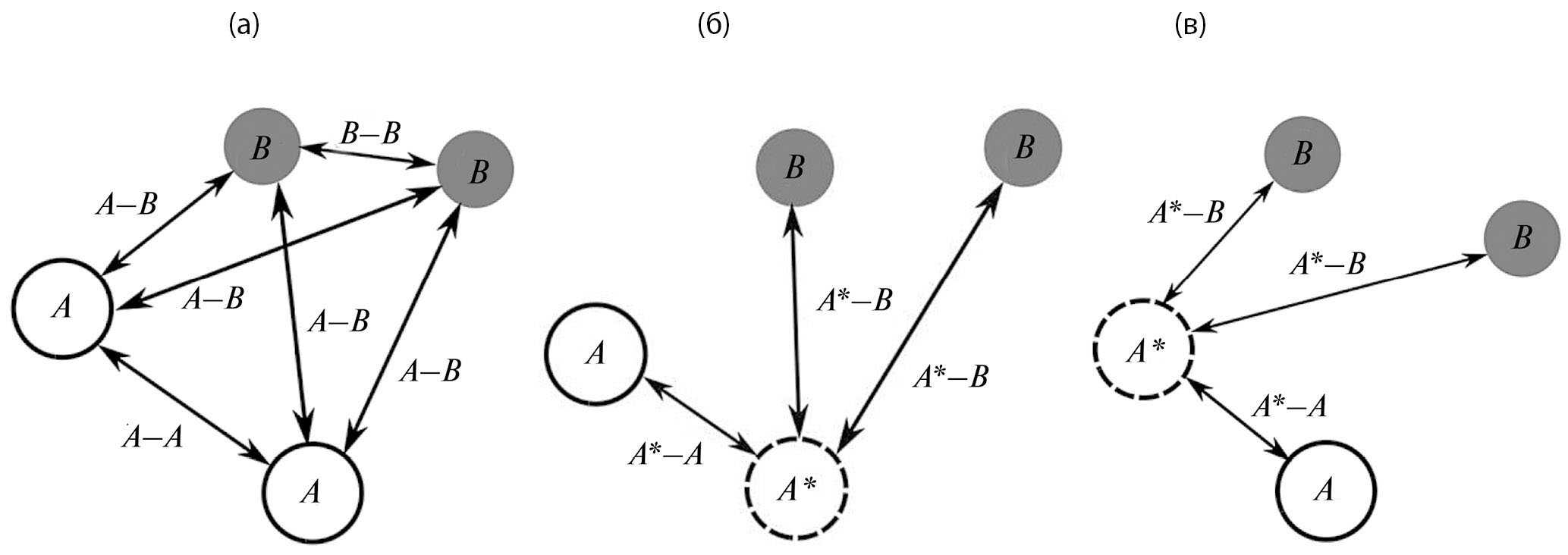 Рис. 1. Иллюстрация пар атомов типов A и B, учитываемых при построении ПРФРА, при отсутствии (а) и наличии (б, в) выделенного поглощающего рентгеновский фотон атома A*.